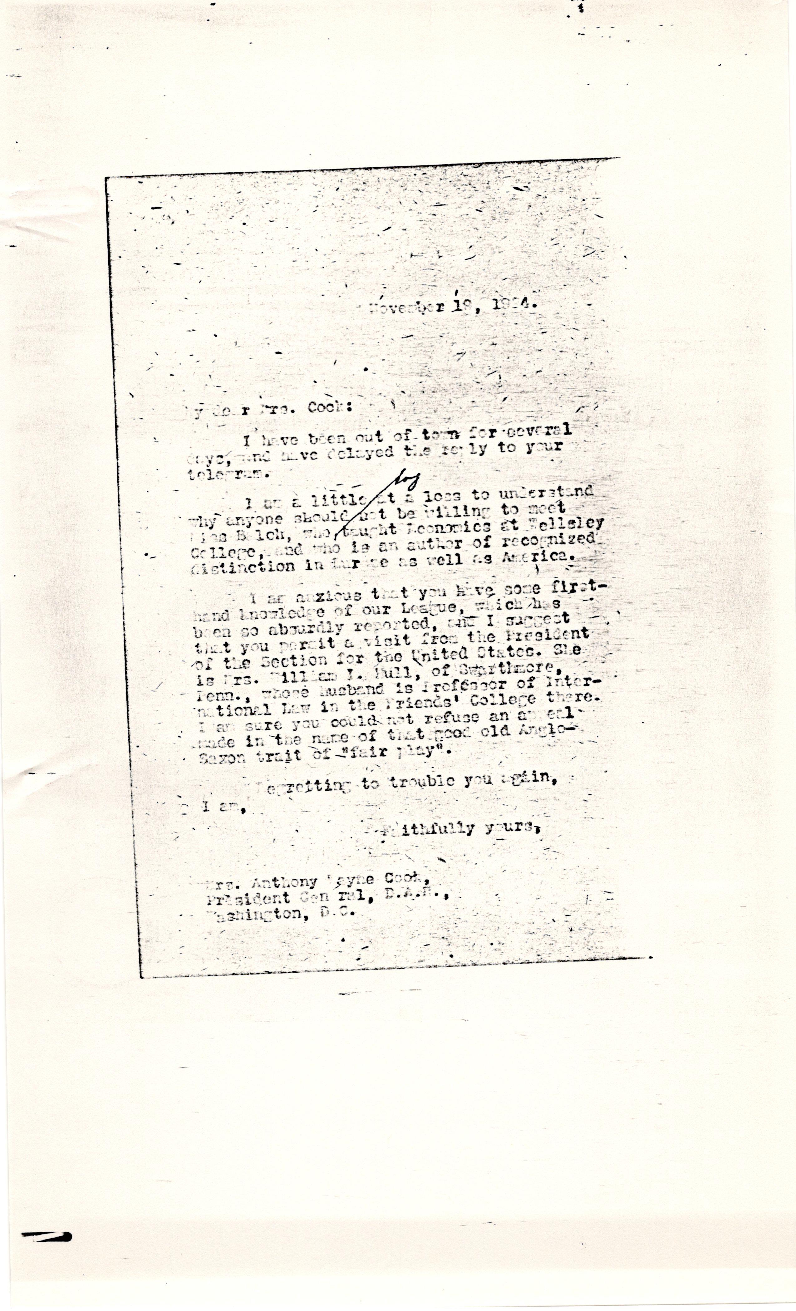 I am anxious that you have some first-hand knowledge of our League, which has been so absurdly reported, and I suggest that you permit a visit from the President of the Section for the United States. She is Mrs. William I. Hull, of Swarthmore, Penn., whose husband is Professor of International Law in the Friend's College there. I am sure you could not refuse an appeal made in the name of that good old Anglo-Saxon trait of "fair play."