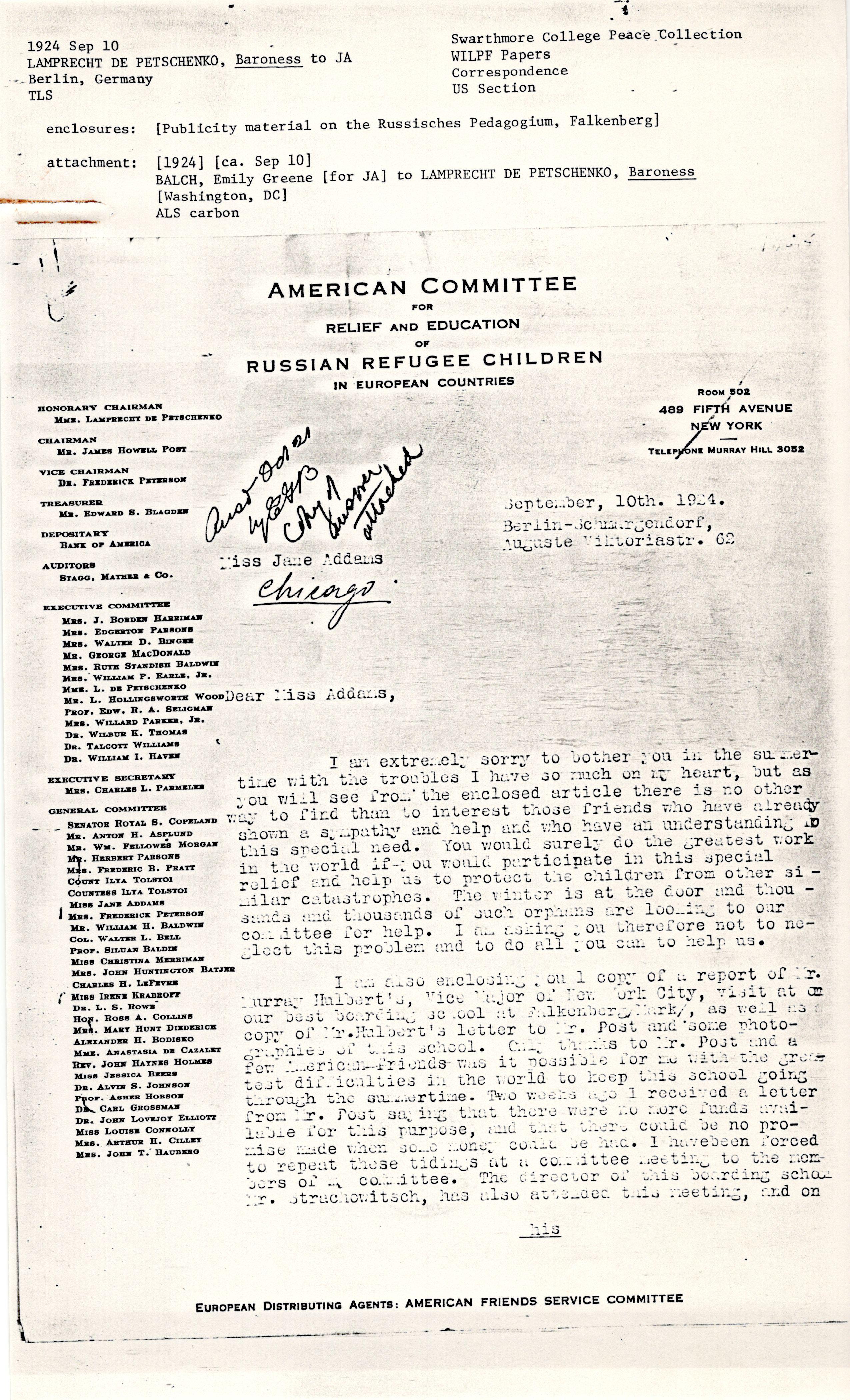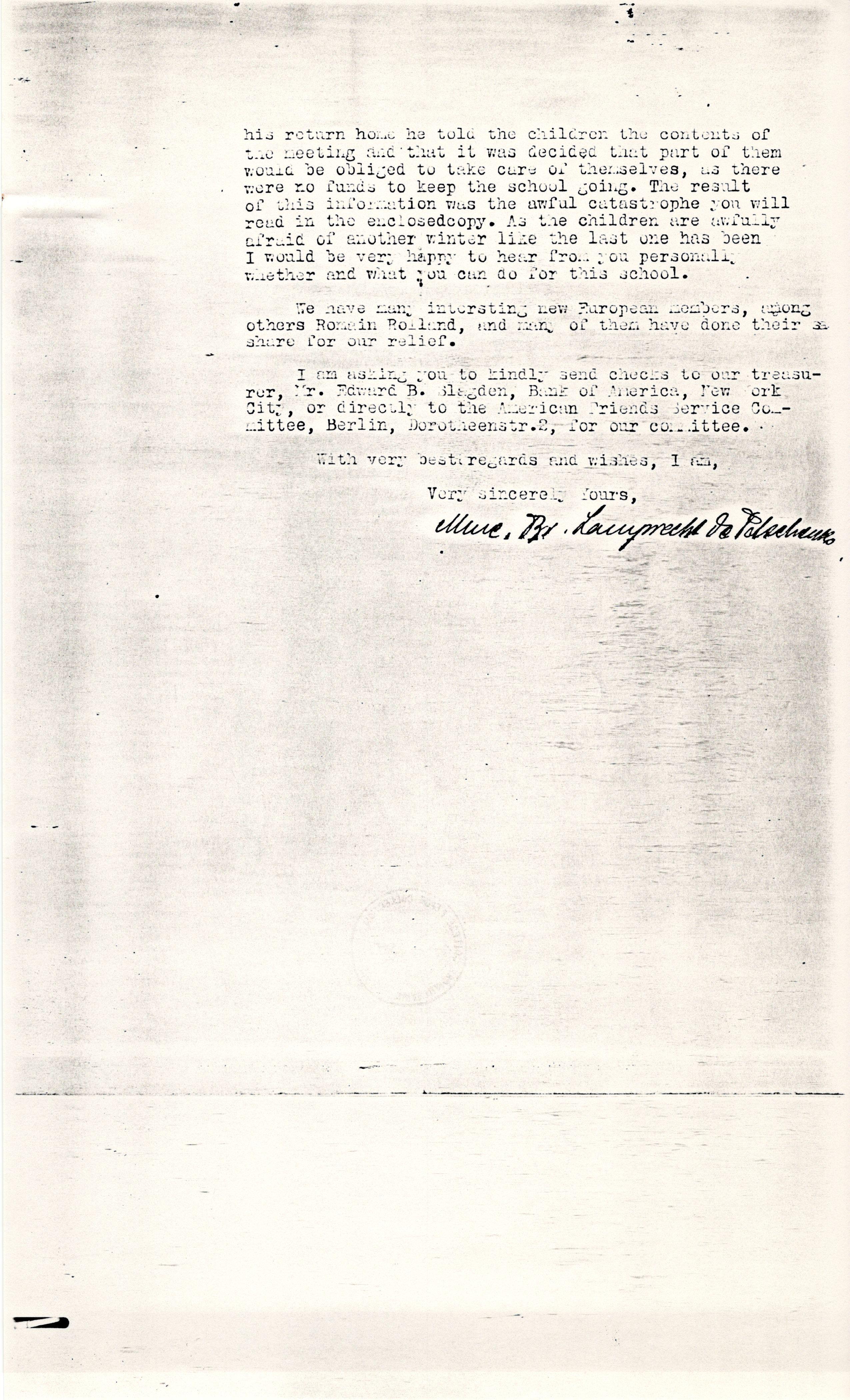I am asking you to kindly send checks to our treasurer, Mr. Edward [S. Blagden], Bank of America, New York City, or directly to the American Friends Service Committee, Berlin, Dorotheenstr. 2, for our committee.