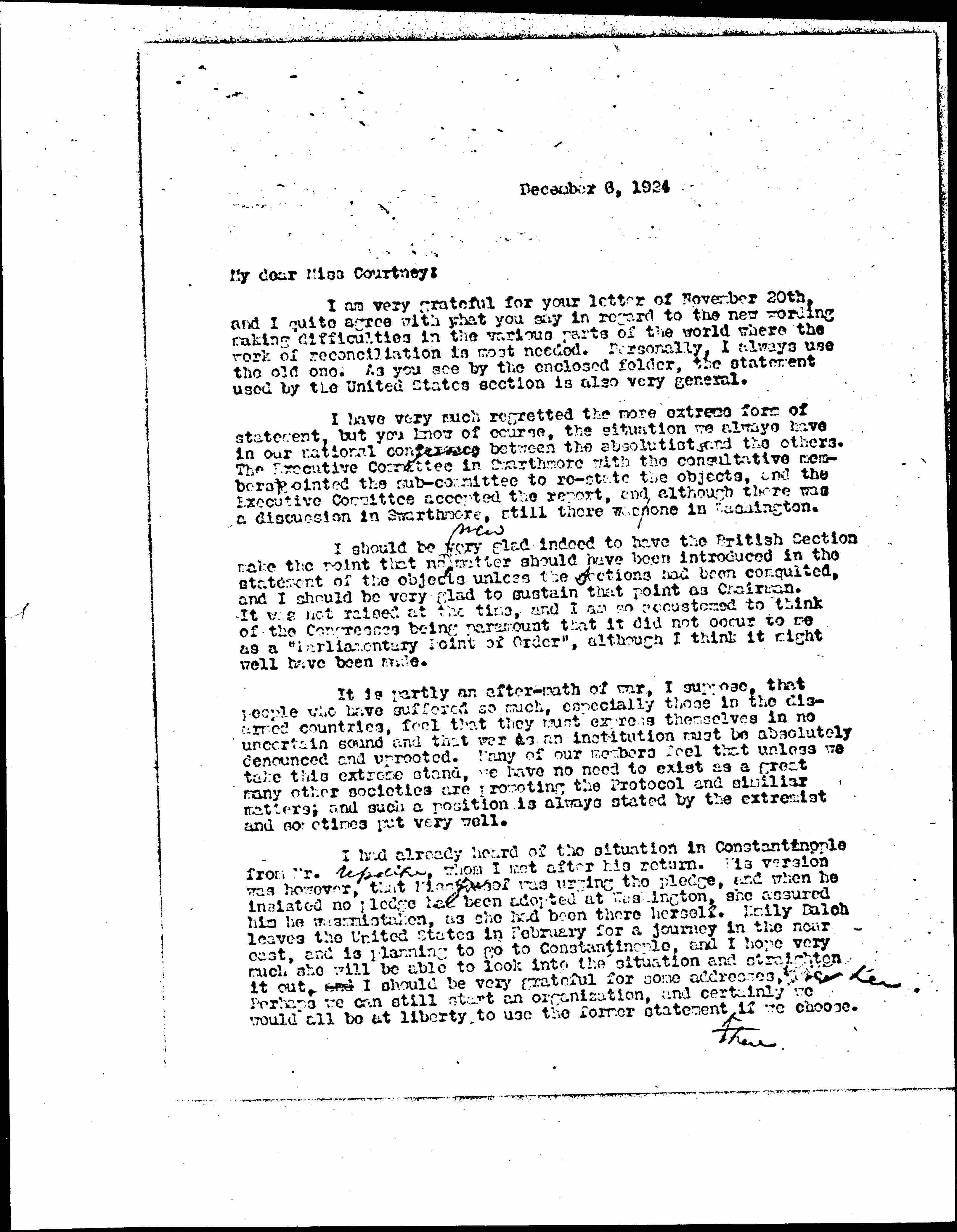 I have very much regretted the more extreme form of statement, but you know of course, the situation we always have in our national [congress] between the absolutists and the others. The Executive Committee in Swarthmore with the consultative members [appointed?] the [subcommittee] to [restate] the objects, and the Executive Committee accepted the report, and although there was a discussion in Swarthmore, still there was none in Washington.