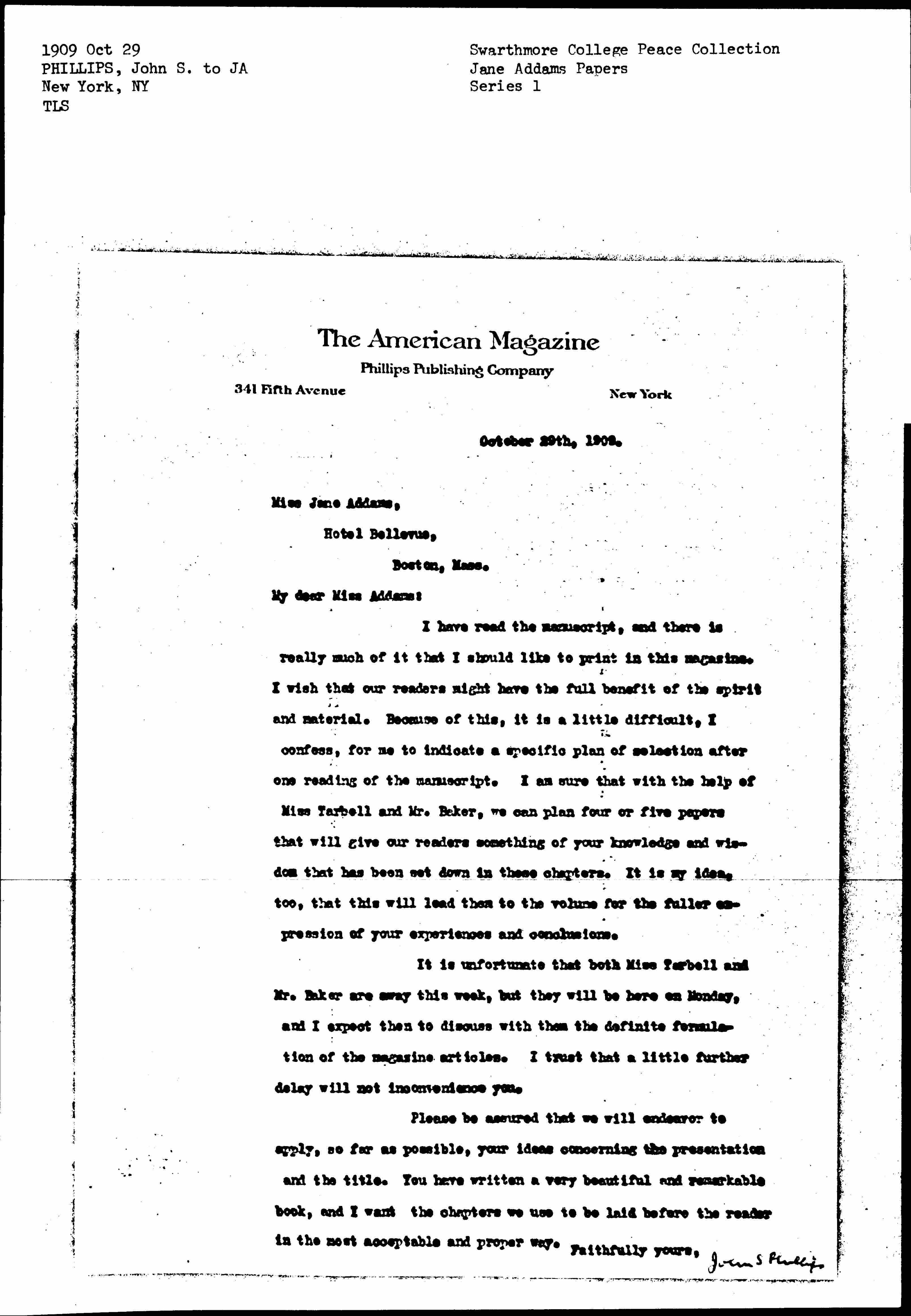 I have read the manuscript, and there is really much of it that I should like to print in this magazine. I wish that our readers might have the full benefit of the spirit and material. Because of this, it is a little difficult, I confess, for me to indicate a specific plan of selection after one reading of the manuscript. I am sure that with the help of Miss Tarbell and Mr. Baker, we can plan four or five papers that will give our readers something of your knowledge and wisdom that has been set down in these chapters. It is my idea, too, that this will lead them to the volume for the fuller impression of your experiences and conclusions.