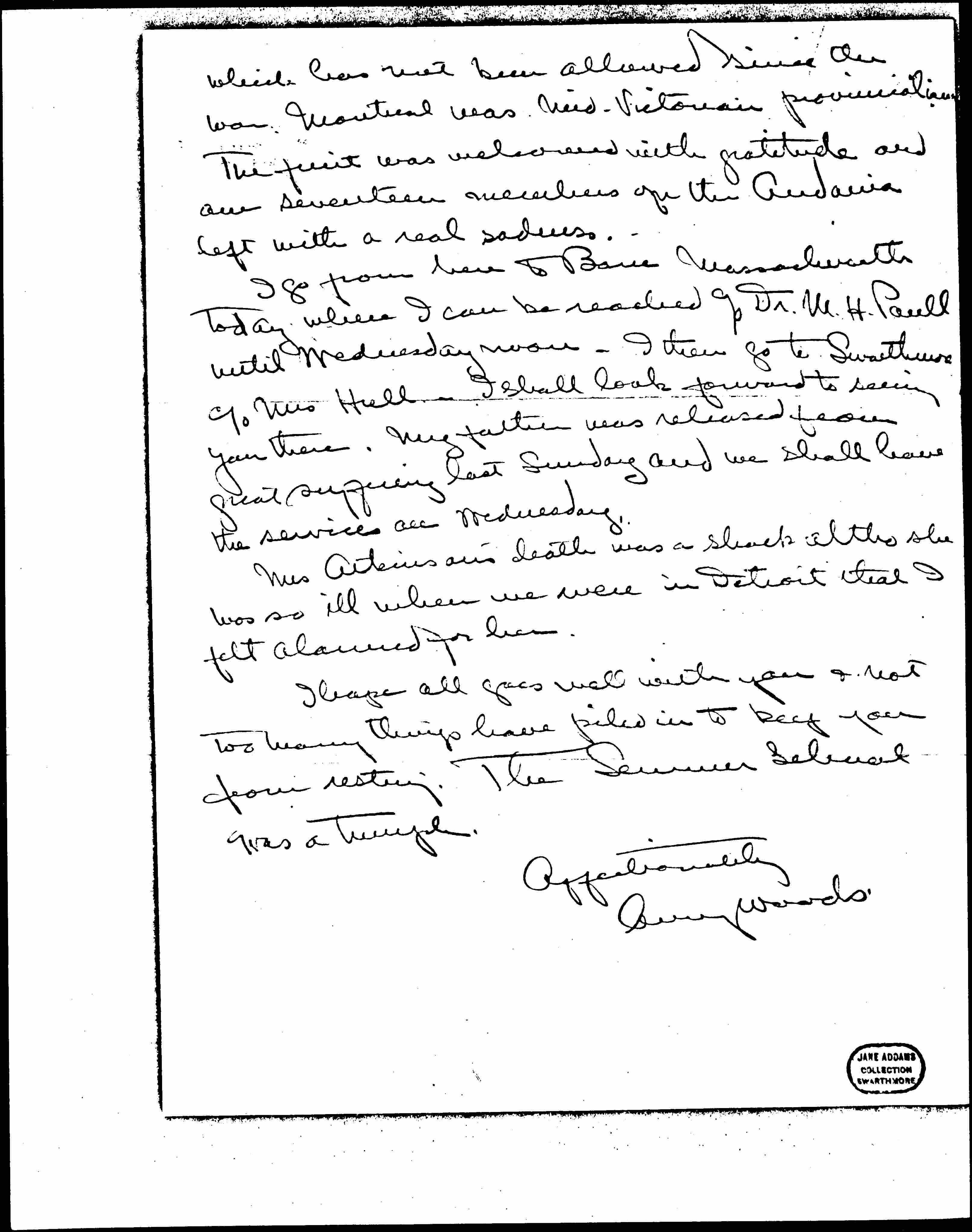 I go from here to Barre Massachusetts today where I can be reached c/o Dr. M. H. Paull until Wednesday noon. I then go to Swarthmore c/o Mrs. Hull. I shall look forward to seeing you there. My father was released from great suffering last Sunday and we shall have the services on Wednesday.