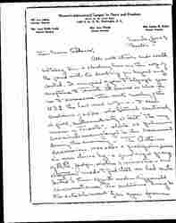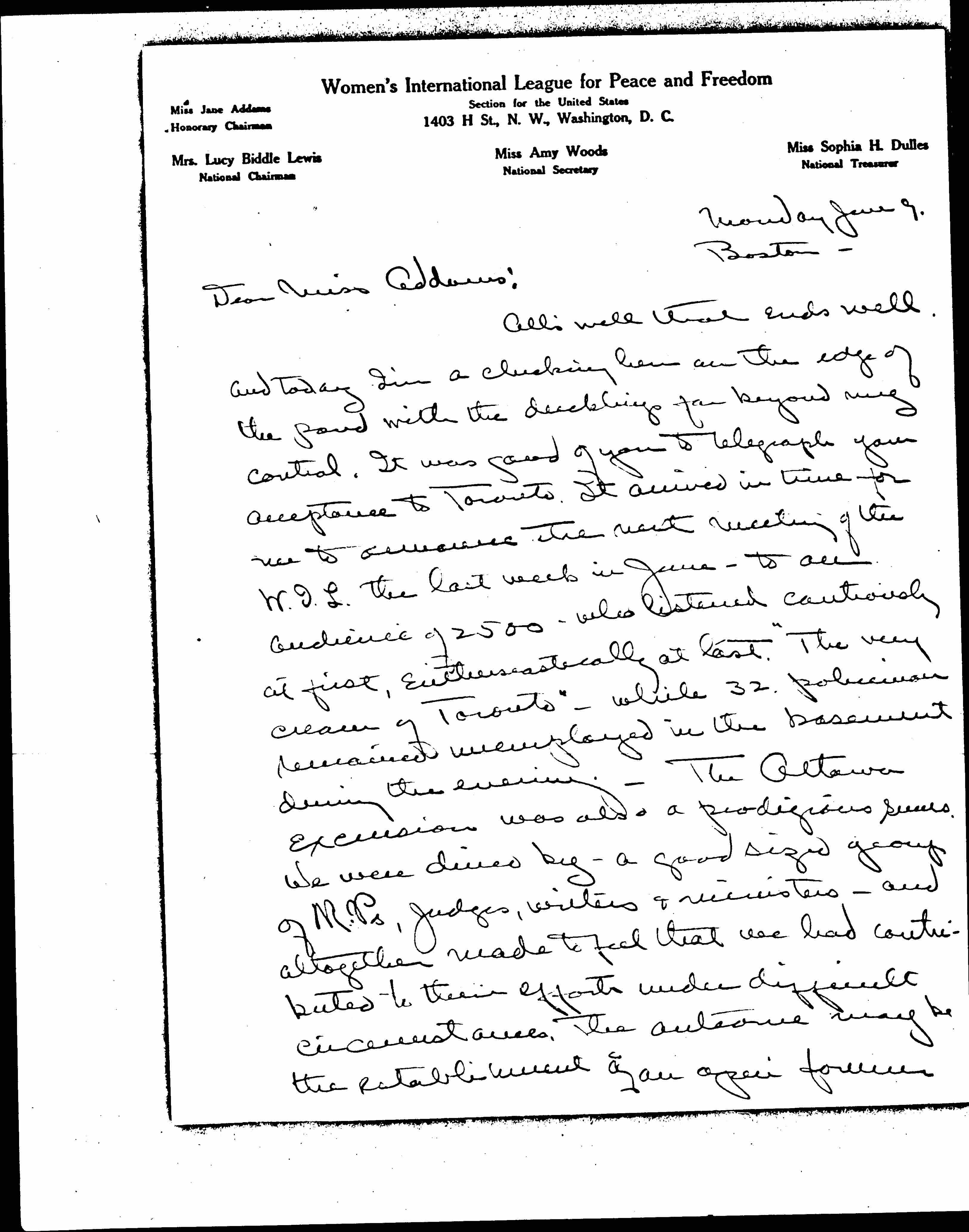 All's well that ends well. And today I'm a clucking hen on the edge of the pond with the ducklings far beyond my control. It was good of you to telegraph your acceptance to Toronto. It arrived in time for me to announce the next meeting of the W.I.L. the last week in June -- to an audience of 2500 -- who listened cautiously at first, enthusiastically at last. "The very cream of Toronto" -- while 32 policemen remained unemployed in the basement during the evening. The Ottawa excursion was also a prodigious success. We were dined by -- a good sized group of M.Ps, judges, writers & ministers -- and altogether made to feel that we had contributed to their efforts under difficult circumstances. The outcome may be the establishment of an open forum [page 2] which has not been allowed since the war. Montreal was mid-Victorian provincialism. The fruit was welcomed with gratitude and our seventeen members of the Andania left with a real sadness.