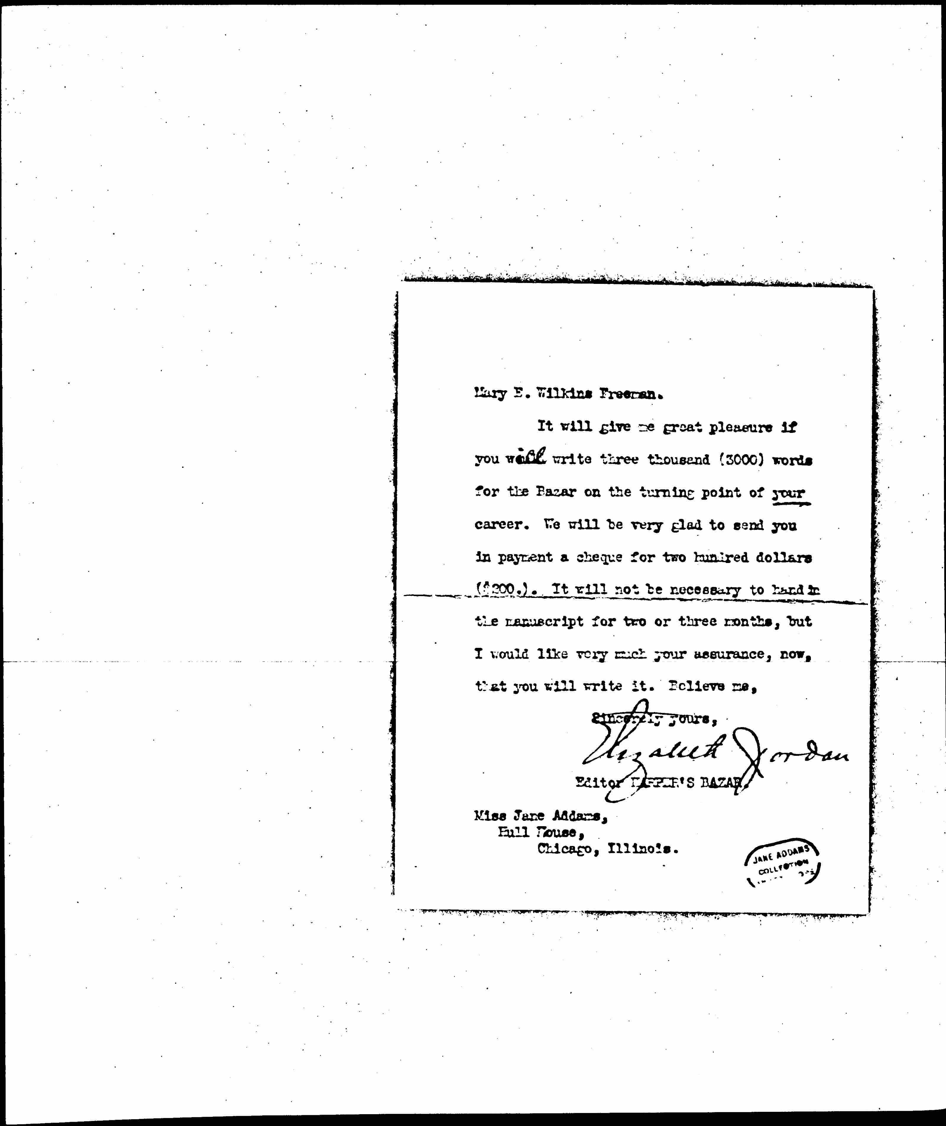 It will give me great pleasure if you will write three thousand (3000) words for the Bazar on the turning point of your career. We will be very glad to send you in payment a [check] for two hundred dollars ($200.). It will not be necessary to hand in the manuscript for two or three months, but i would like very much your assurance, now, that you will write it. Believe me,