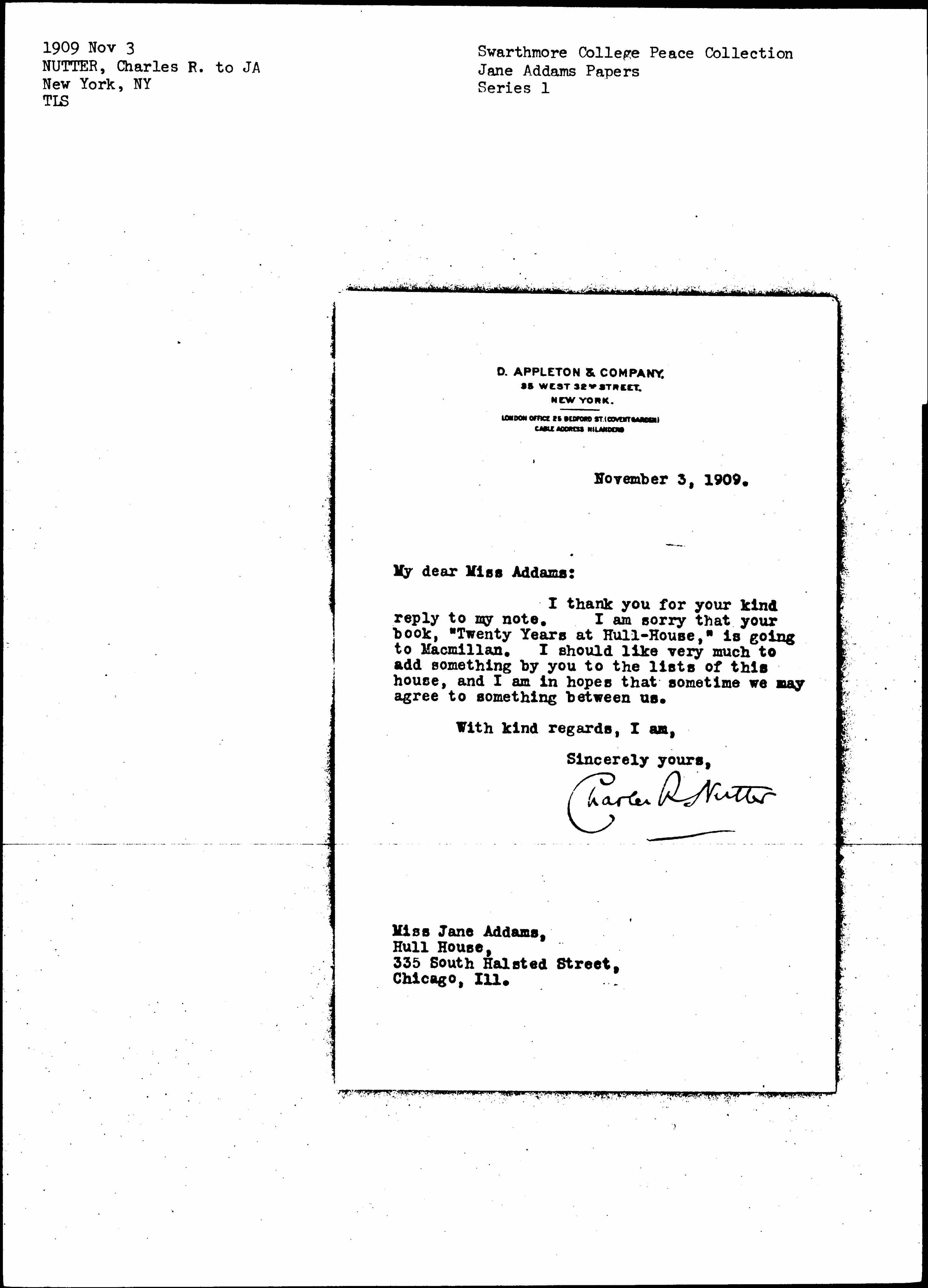 I thank you for your kind reply to my note. I am sorry that your book, "Twenty Years at Hull-House," is going to Macmillan. I should like very much to add something by you to the lists of this house, and I am in hopes that sometime we may agree to something between us.