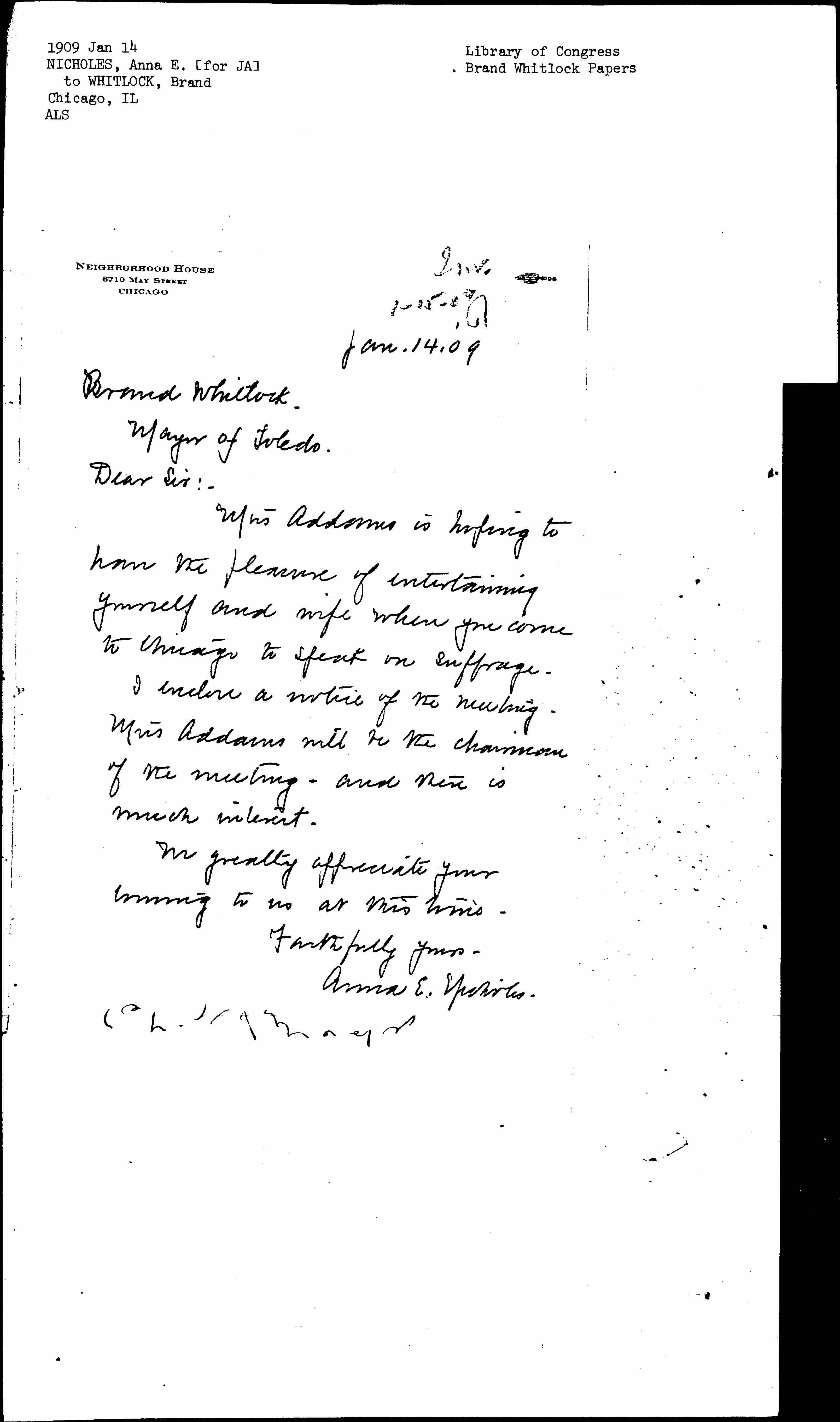Miss Addams is hoping to have the pleasure of entertaining yourself and wife when you come to Chicago to speak on suffrage.