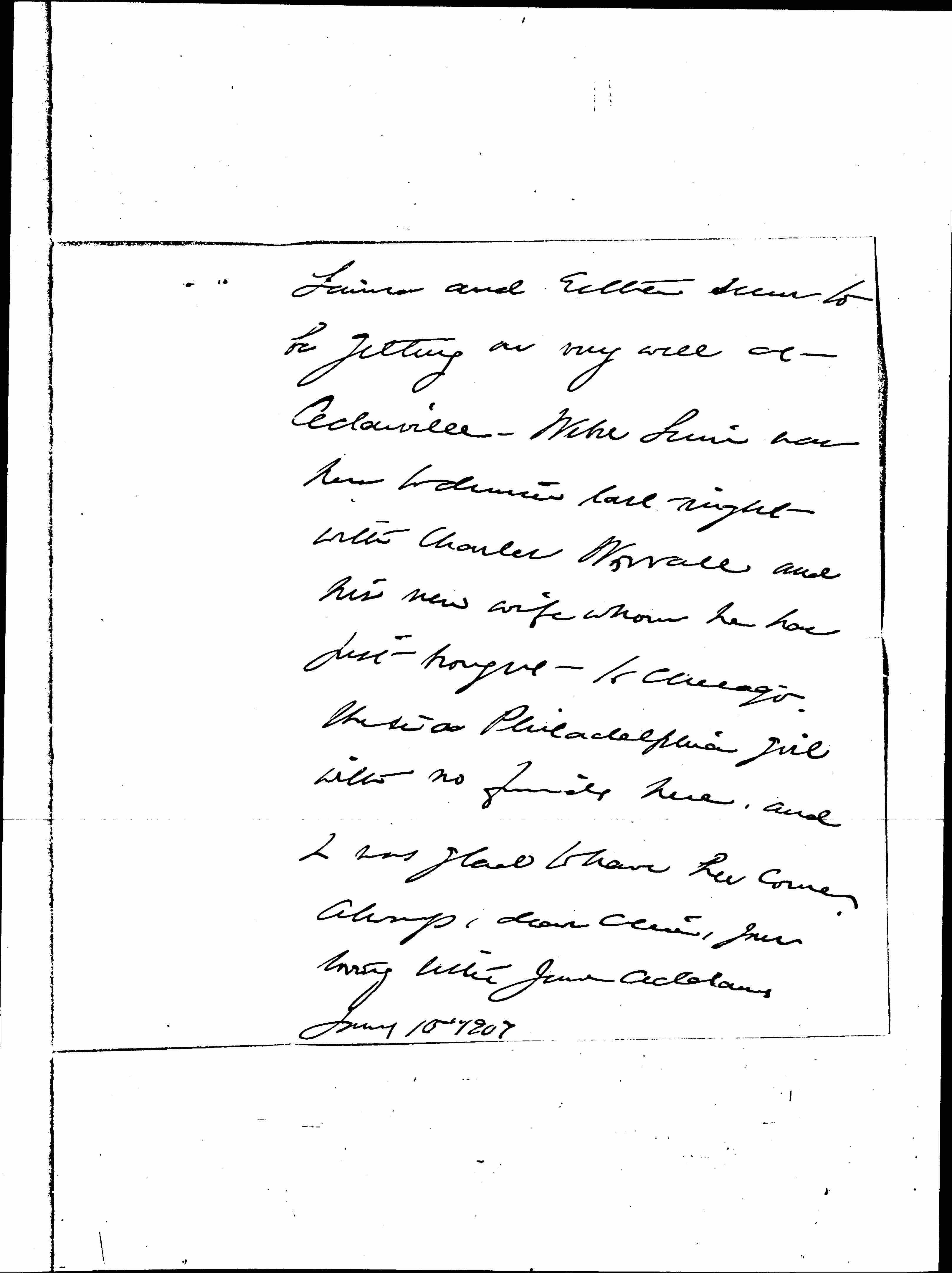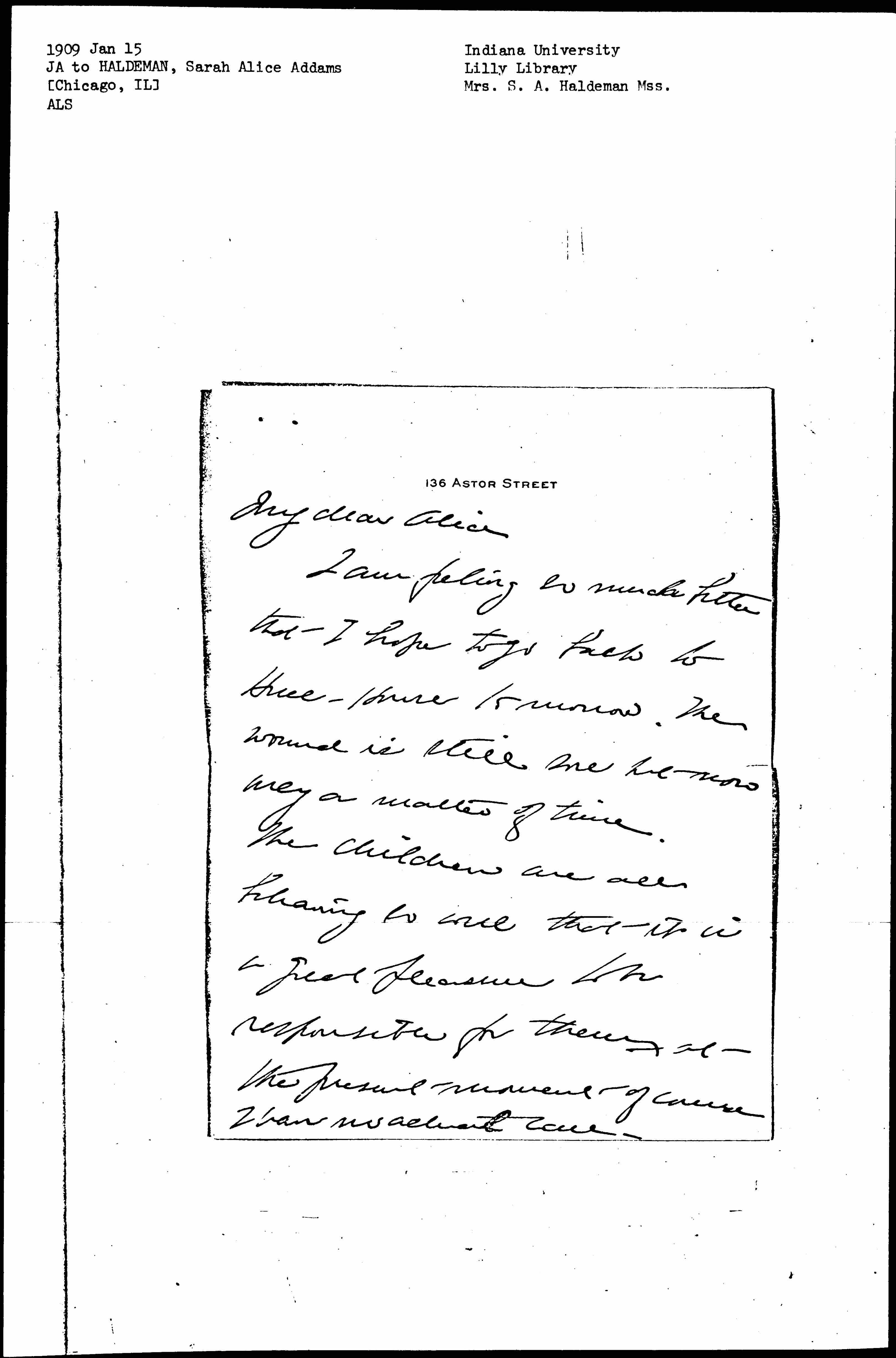 Laura and Esther seem to be getting on very well at Cedarville. Weber Linn was here to dinner last night with Charles Worrall and his new wife whom he has just brought to Chicago. She is a Philadelphia girl with no family here, and I was glad to have her come. Always, dear Alice, your loving sister Jane Addams