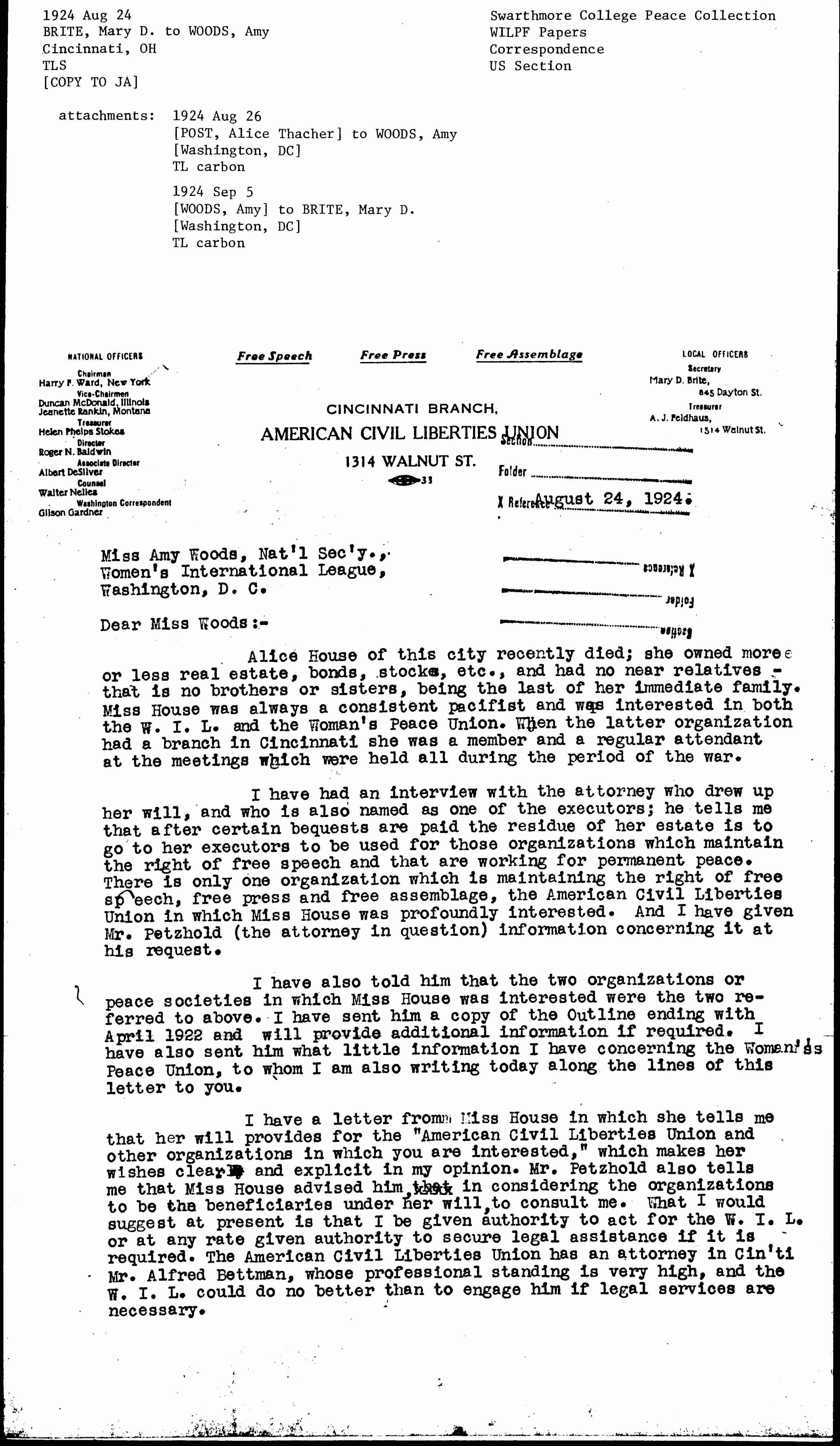 I have a letter from Miss House in which she tells me that her will provides for the "American Civil Liberties Union and other organizations in which you are interested," which makes her wishes clear and explicit in my opinion. Mr. Petzhold also tells me that Miss House advised him, that in considering the organizations to be the beneficiaries under her will, to consult me. What I would suggest at the present is that I be given authority to act for this W.I.L. or at any rate given authority to secure legal assistance if it is required. The American Civil Liberties Union has an attorney in Cin'ti Mr. Alred Bettman, whose professional standing is very high, and the W.I.L. could do no better than to engage him if legal services are necessary. [page 2]