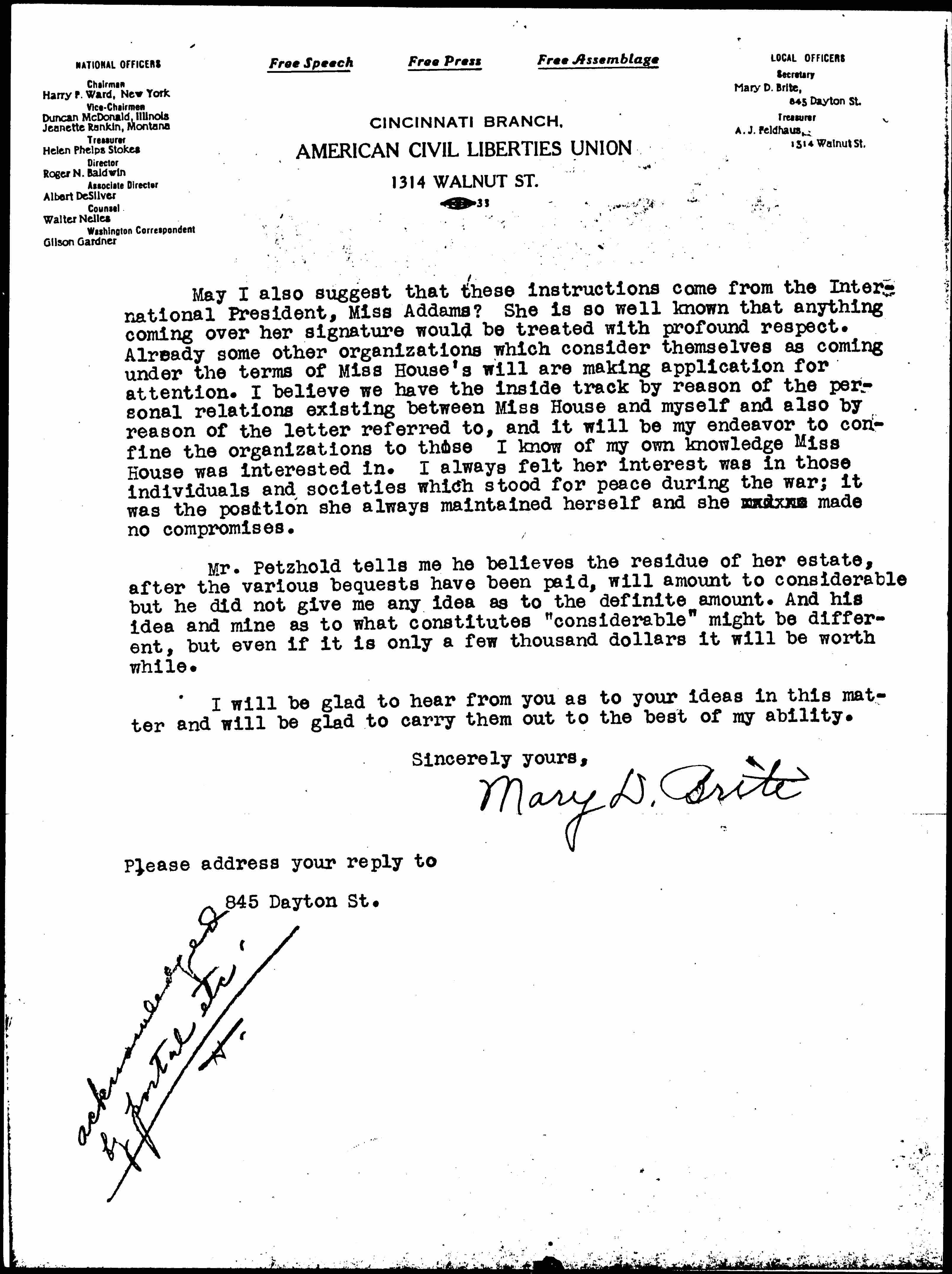 I have had an interview with the attorney who drew up her will, and who is also named as one of the executors; he tells me that after certain bequests are paid the residue of her estate is to go to her executors to be used for those organizations which maintain the right of free speech and that are working for permanent peace. There is only one organization which is maintaining the right of free speech, free press and free assemblage, the American Civil Liberties Union in which Miss House was profoundly interested. And I have given Mr. Petzhold (the attorney in question) information concerning it at his request.