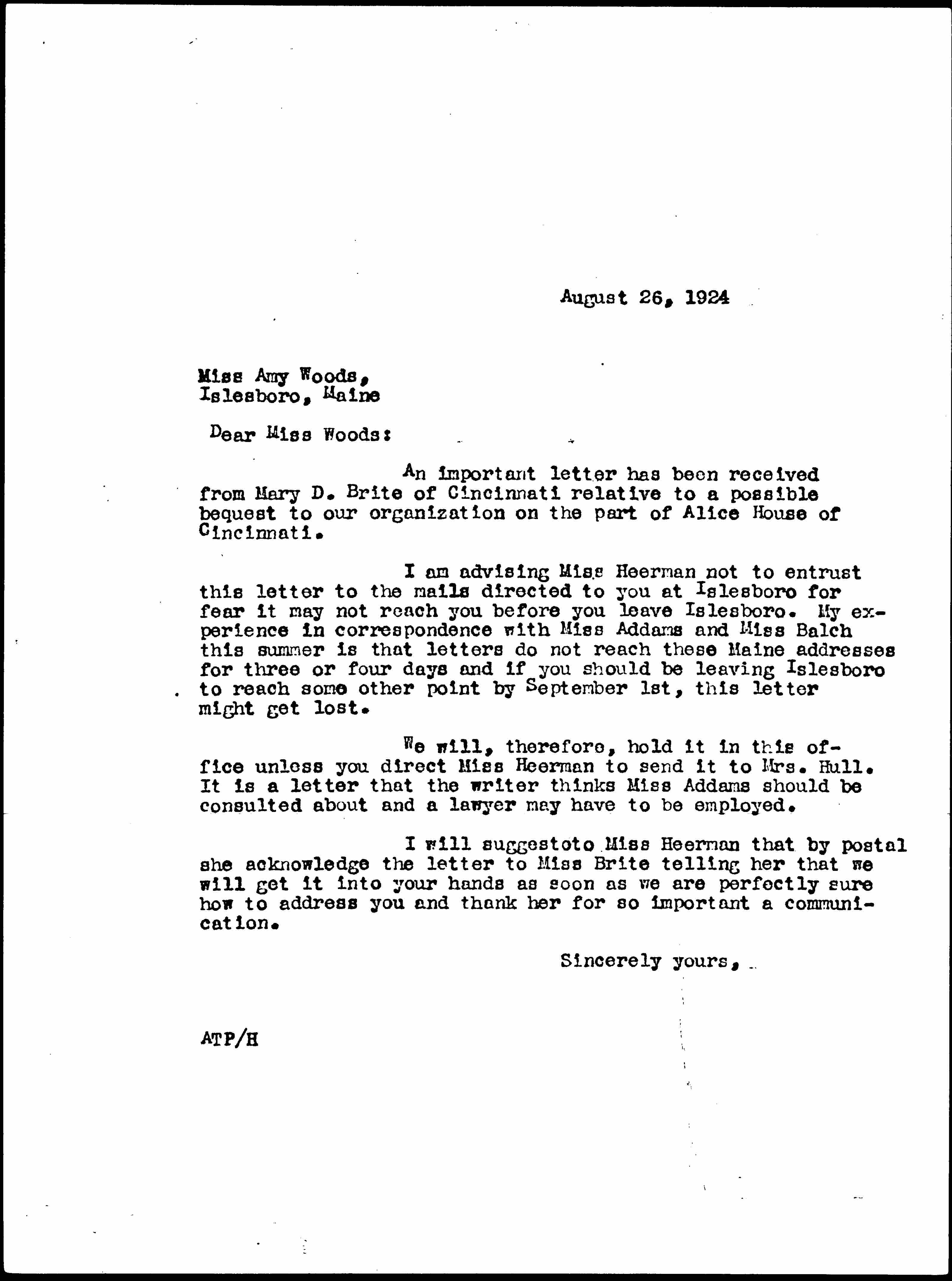 I am advising Miss Heerman not to entrust this letter to the mails directed to you at Islesboro for fear it may not reach you before you leave Islesboro. My experience in correspondence with Miss Addams and Miss Balch this summer is that letters do not reach these Maine addresses for three or four days and if you should be leaving Islesboro to reach some other point by September 1st, this letter might get lost.