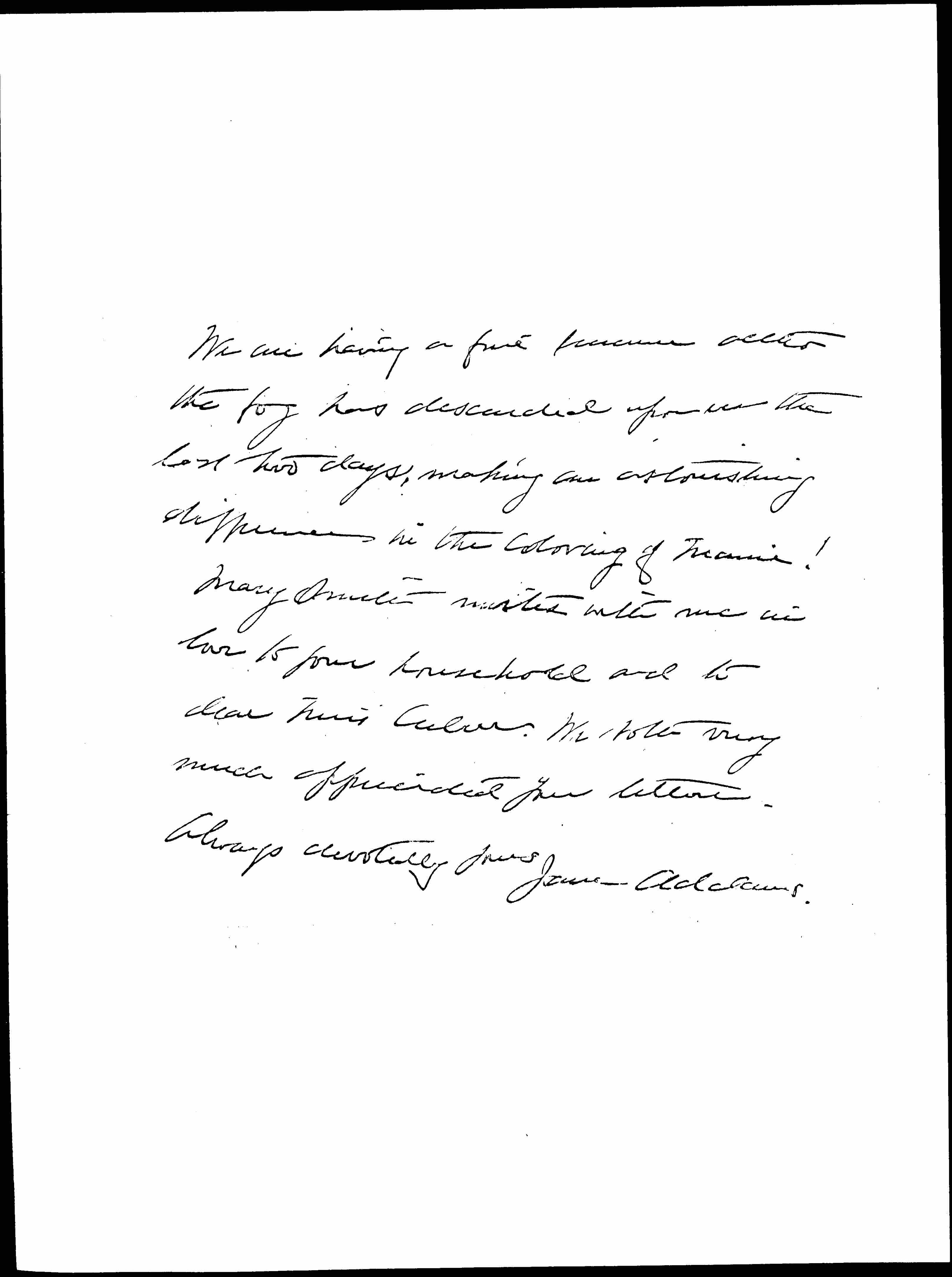 We are having a fine summer [although] the fog has descended upon us the last two days, making an astonishing difference in the coloring of Maine!