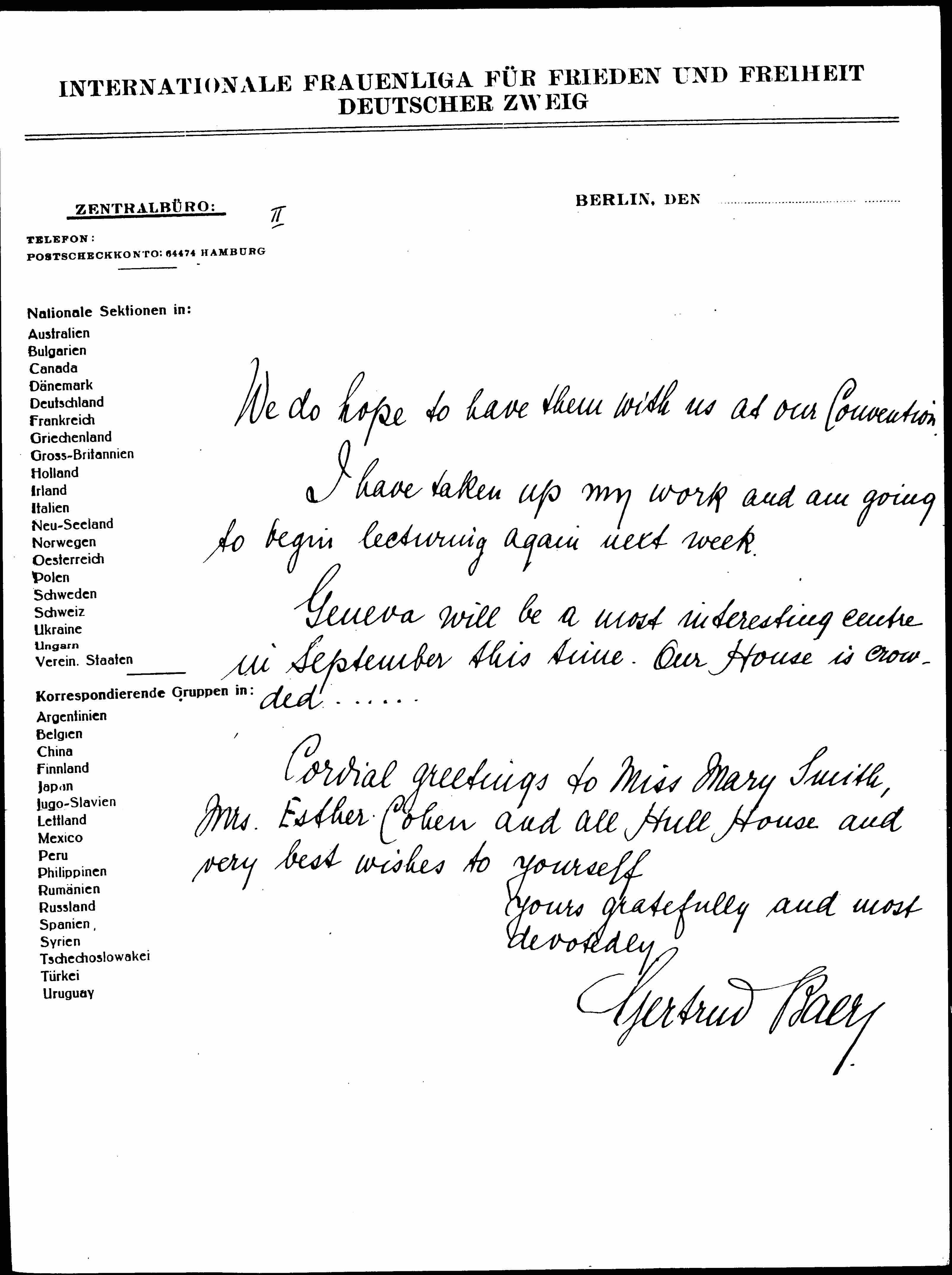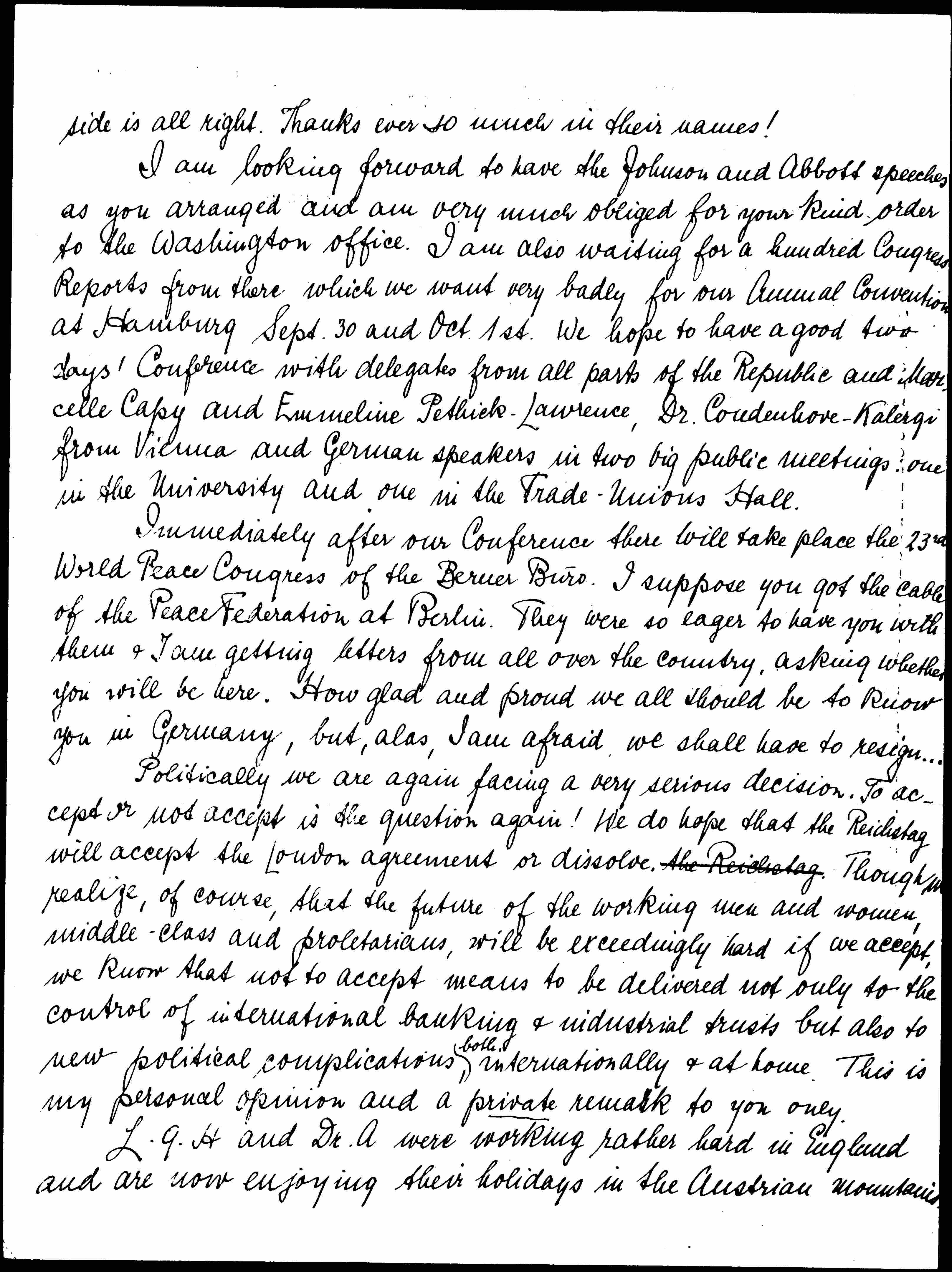 I am looking forward to have the Johnson and Abbott speeches as you arranged and am very much obliged for your kind order to the Washington office. I am also waiting for a hundred Congress Reports from there which we want very badly for our Annual Convention at Hamburg Sept. 30 and Oct. 1st. We hope to have a good two days' Conference with delegates from all parts of the Republic and Marcelle Capy and Emmeline Pethick-Lawrence, Dr. Coudenhove-Kalergi from Vienna and German speakers in two big public meetings one in the University and one in the Trade-Unions Hall.