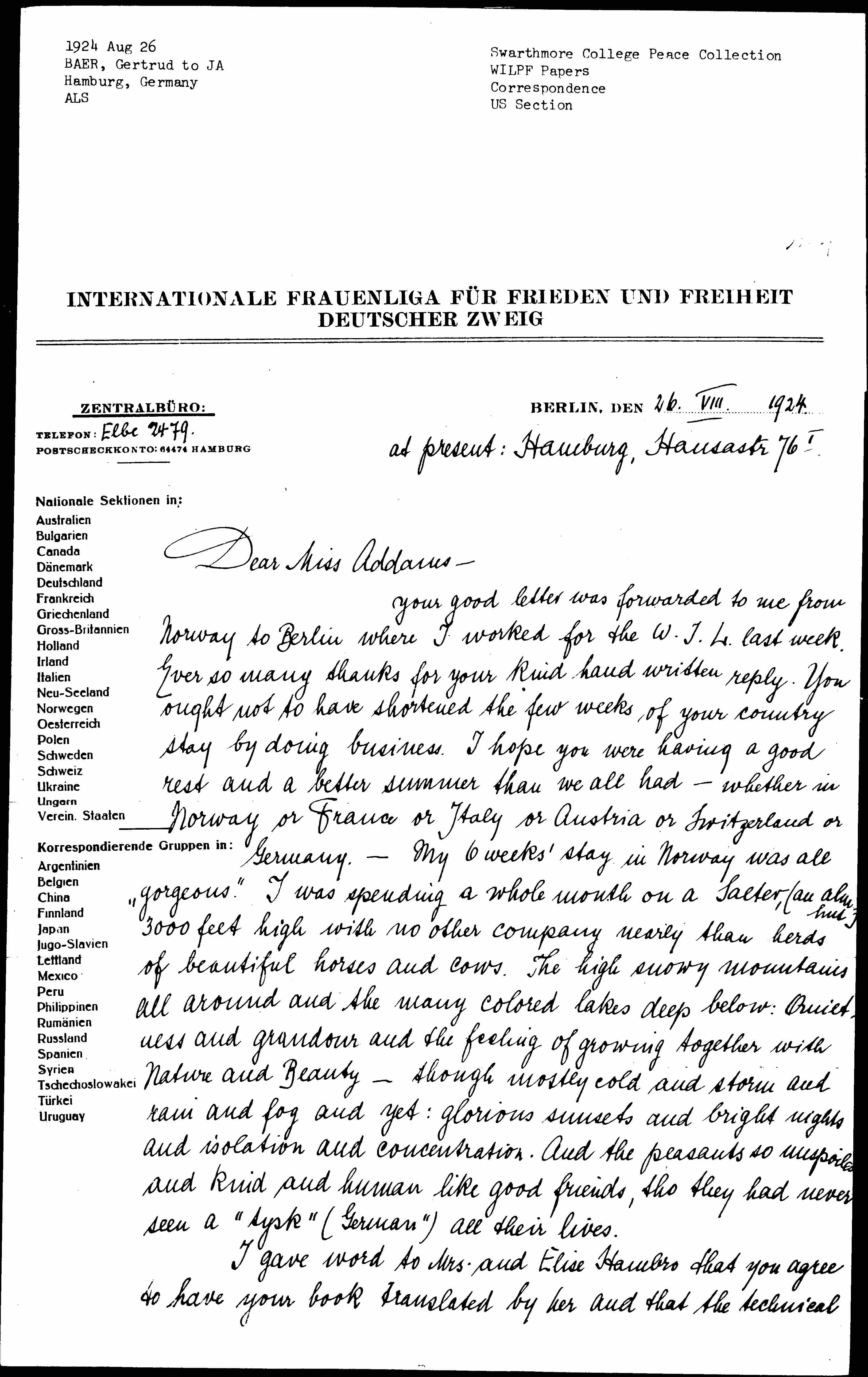 Your good letter was forwarded to me from Norway to Berlin where I worked for the W.I.L. last week. Ever so many thanks for your kind hand written reply. You ought not to have shortened the few weeks of your country stay by doing business. I hope you were having a good rest and a better summer than we all had -- whether in Norway or France or Italy or Austria or Switzerland or Germany. -- My 6 weeks' stay in Norway was all "gorgeous." I was spending a whole month on a Saeter, (an [almhus]) 3000 feet high with no other company nearly than herds of beautiful horses and cows. The high snowy mountains all around and the many colored lakes deep below: Quietness and [grandeur] and the feeling of growing together with Nature and Beauty -- though mostly cold and storm and rain and fog and yet: glorious sunsets and bright nights and isolation and concentration. And the peasants so unspoiled and kind and human like good friends, [though] they had never seen a "tysk" ("German") all their lives.