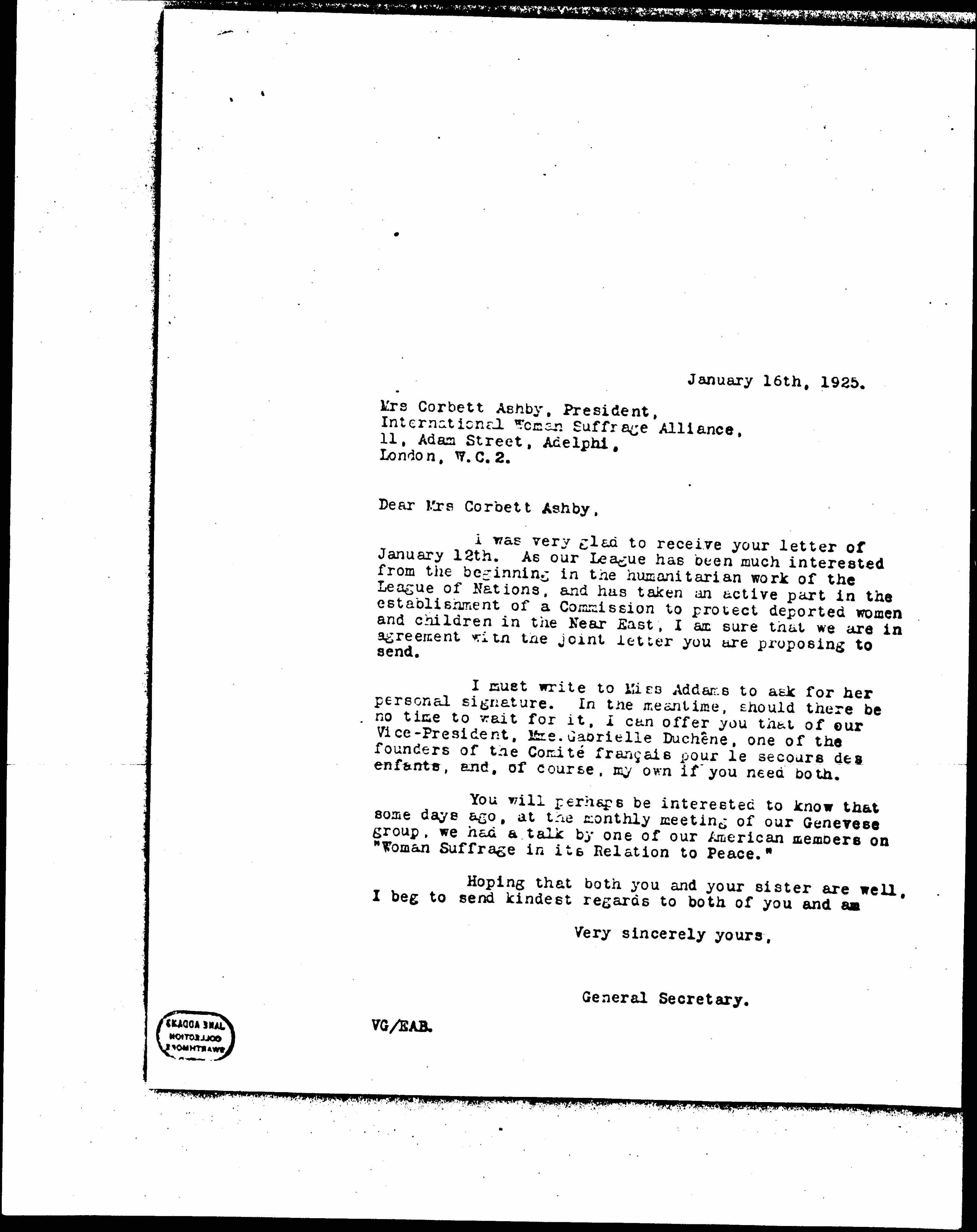 I must write to Miss Addams to ask for her personal signature. In the meantime, should there be no time to wait for it, I can offer you that of our Vice-President, Mme. Gabrielle Duchêne, one of the founders of the Comité français pour le secours des enfante, and, of course, my own if you need both.