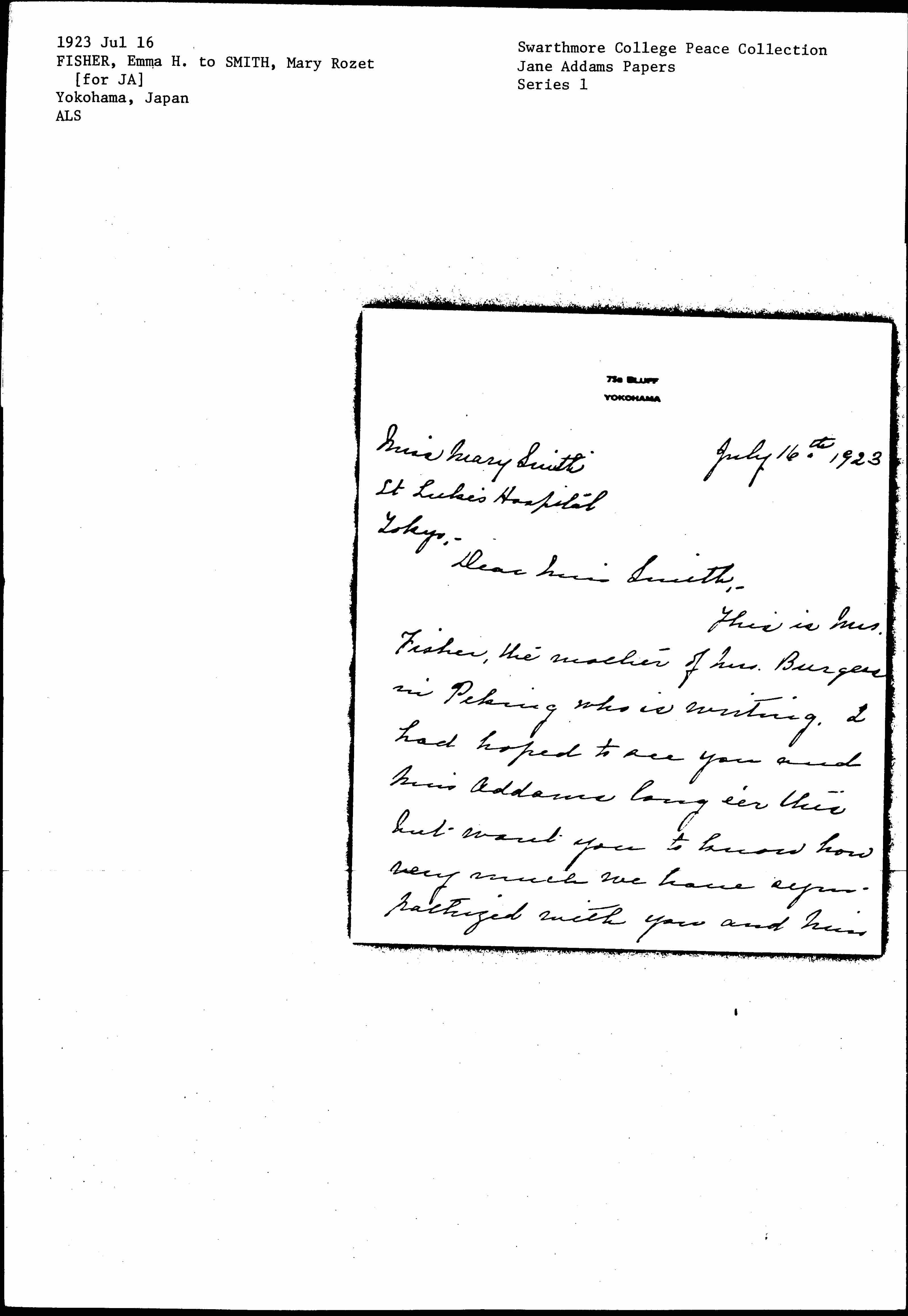This is Mrs. Fisher, the mother of Mrs. Burgess in Peking who is writing. I had hoped to see you and Miss Addams long e'er this but want you to know how very much we have sympathized with you and Miss [page 2] Addams in the operation and consequent weakness.