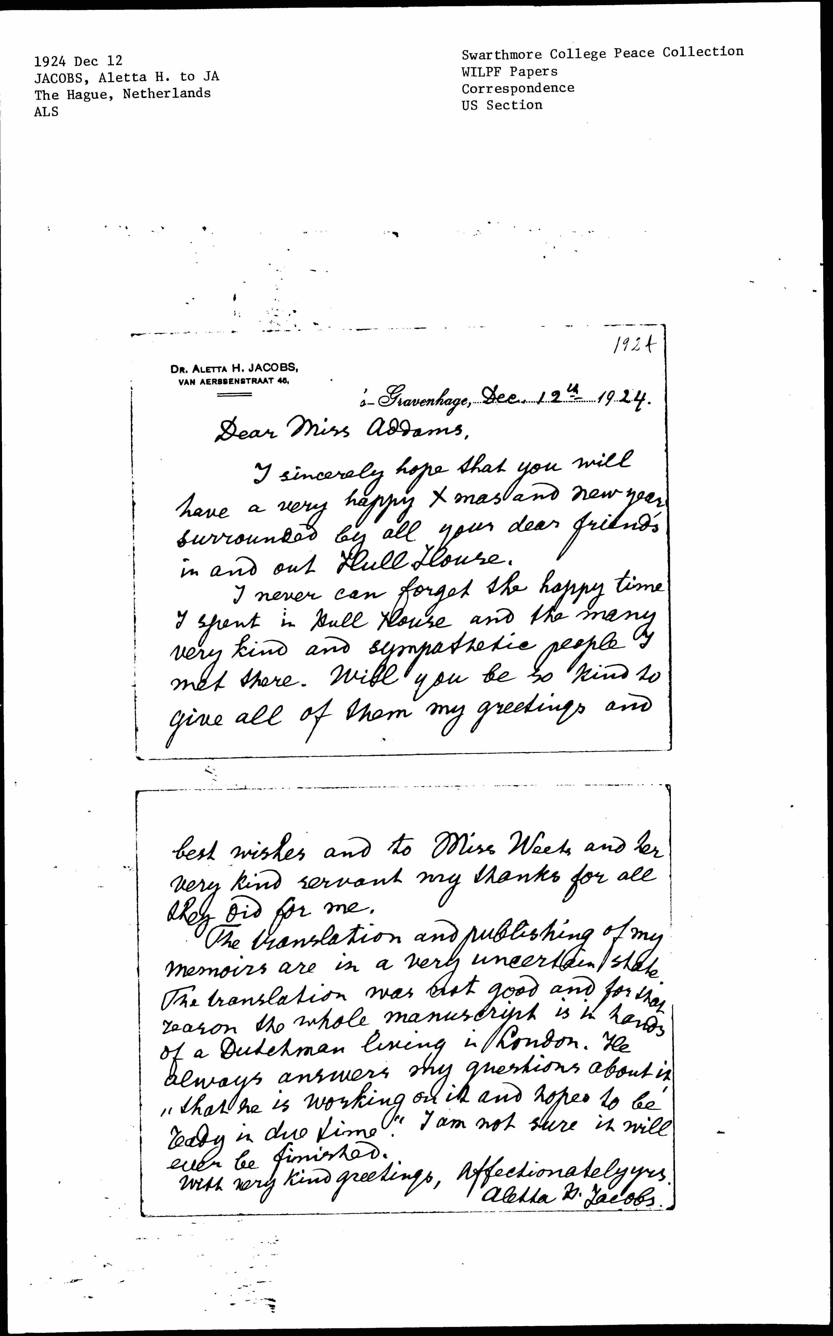 I never can forget the happy time I spent in Hull House and the many very kind and sympathetic people I met there. Will you be so kind to give all of them my greetings and [page 2] best wishes and to Miss Weeks and her very kind servant my thanks for all they did for me.