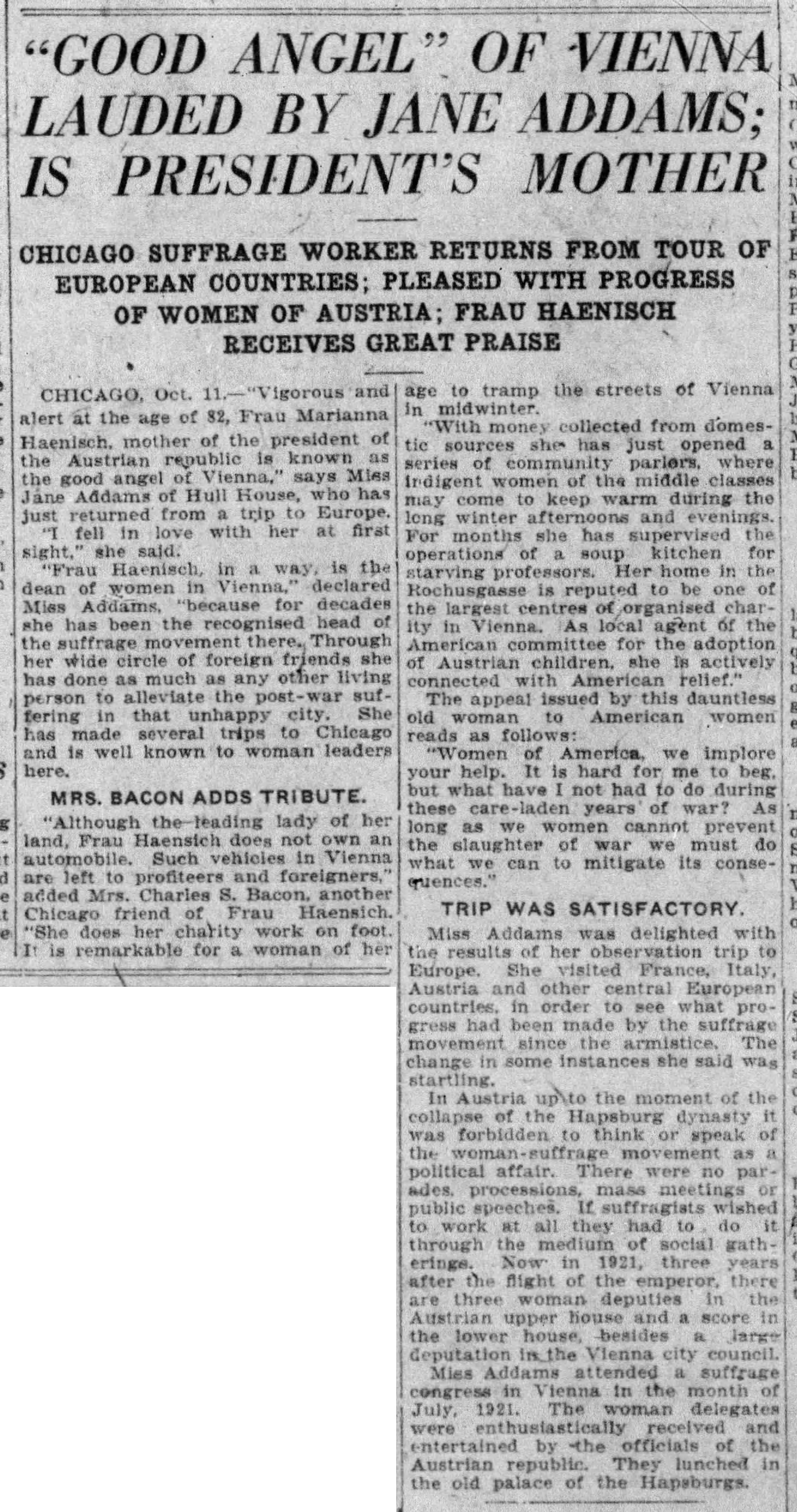 CHICAGO, Oct. 11. -- "Vigorous and alert at the age of 82, Frau [Marianne Hainisch], mother of the president of the Austrian republic is known as the good angel of Vienna," says Miss Jane Addams of Hull House, who has just returned from a trip to Europe.