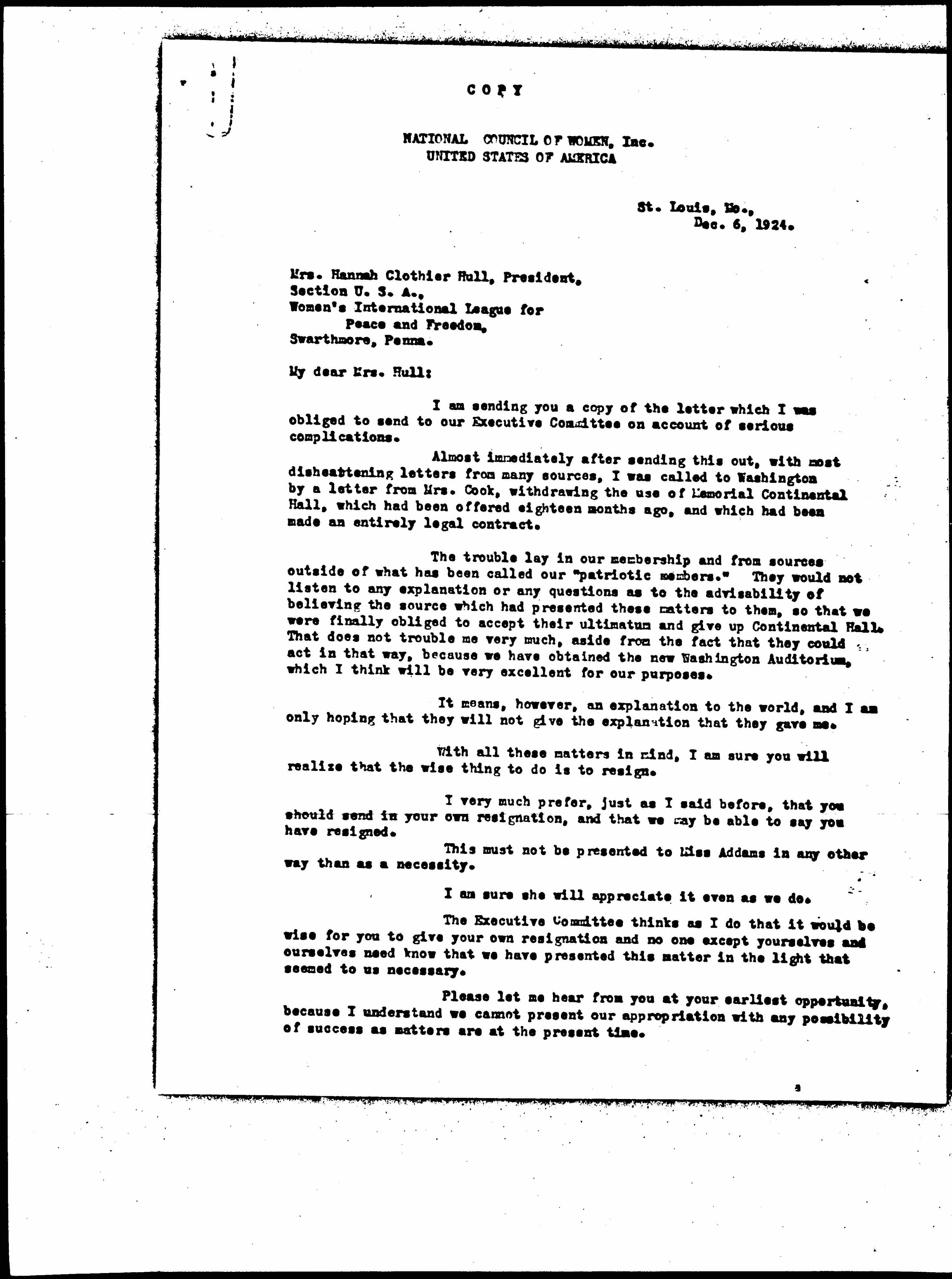 Almost immediately after sending this out, with most disheartening letters from many sources, I was called to Washington by a letter from Mrs. Cook, withdrawing the use of Memorial Continental Hall, which had been offered eighteen months ago, and which had been made an entirely legal contract.