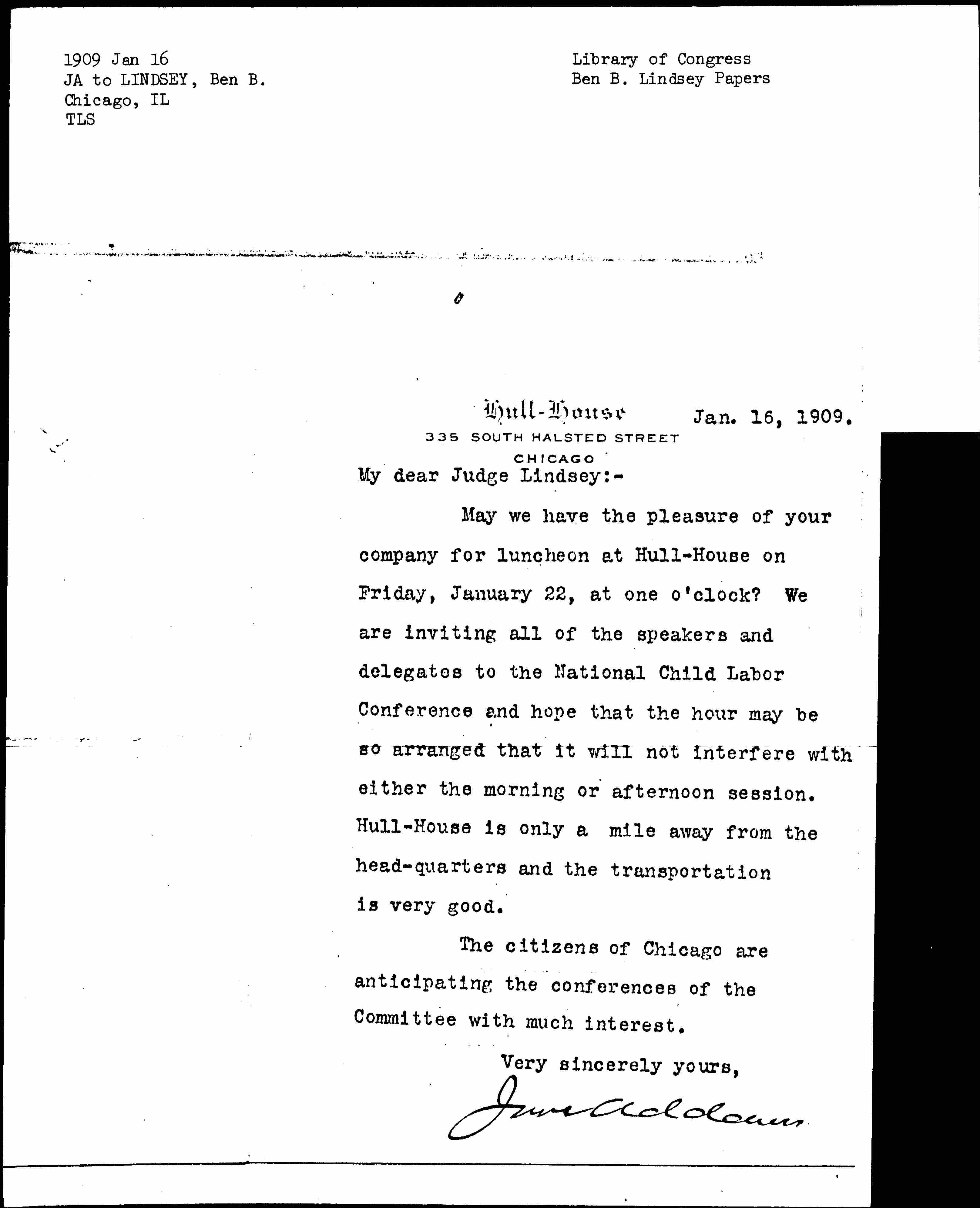 May we have the pleasure of your company for luncheon at Hull-House on Friday, January 22, at one o'clock? We are inviting all of the speakers and delegates to the National Child Labor Conference and hope that the hour may be so arranged that it will not interfere with either the morning or afternoon session. Hull-House is only a mile away from the [headquarters] and the transportation is very good.