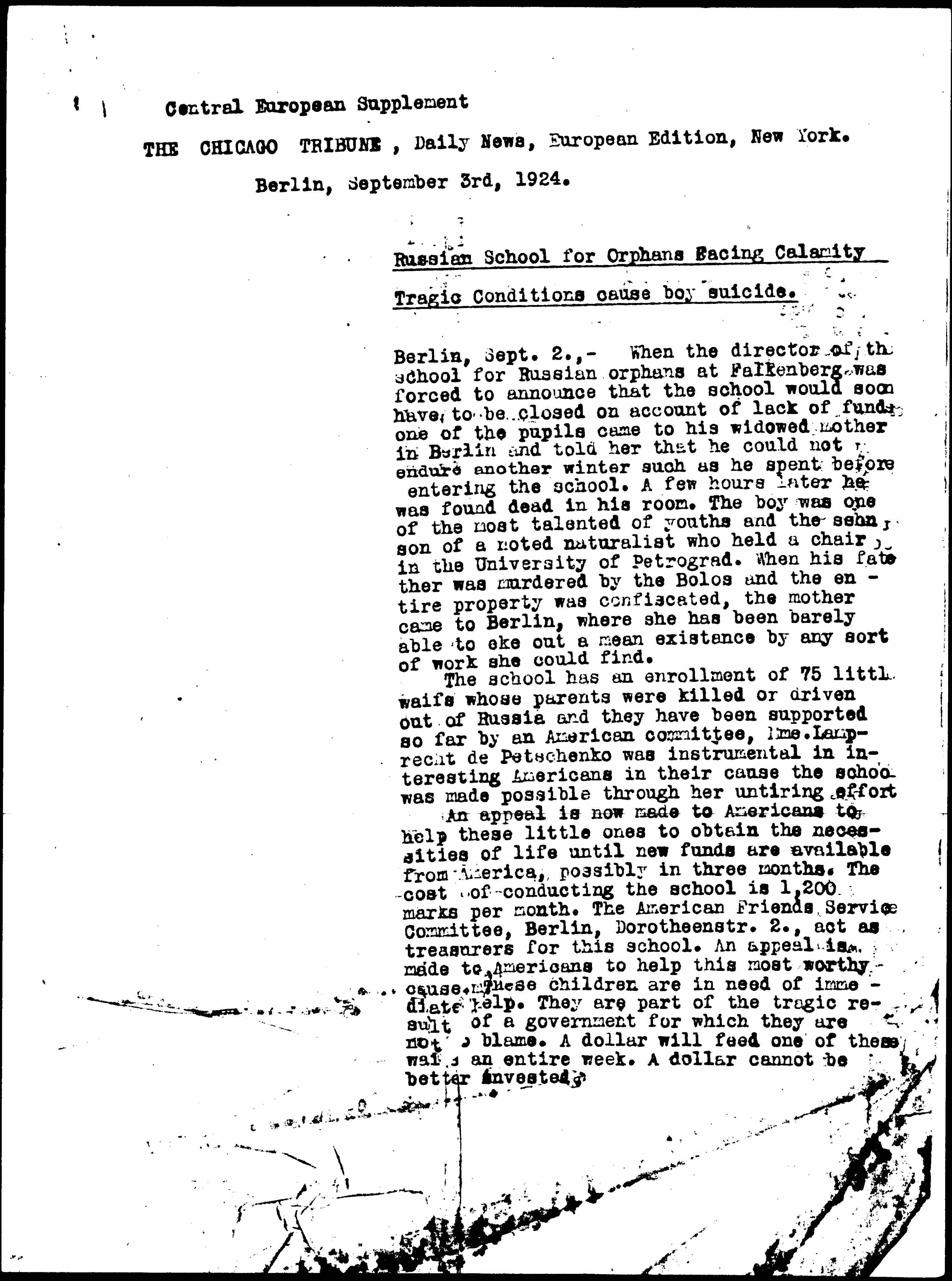 Berlin, Sept. 2., -- When the director of the school for Russian orphans at Falkenberg was forced to announce that the school would soon have to be closed on account of lack of funds one of the pupils came to his widowed mother in Berlin and told her that he could not endure another winter such as he spent before entering the school. A few hours later he was found dead in his room. The boy was one of the most talented of youths and the son of a noted naturalist who held a chair in the University of Petrograd. When his father was murdered by the Bolos and the entire property was confiscated, the mother came to Berlin, where she had been barely able to eke out a mean existence by any sort of work she could find.