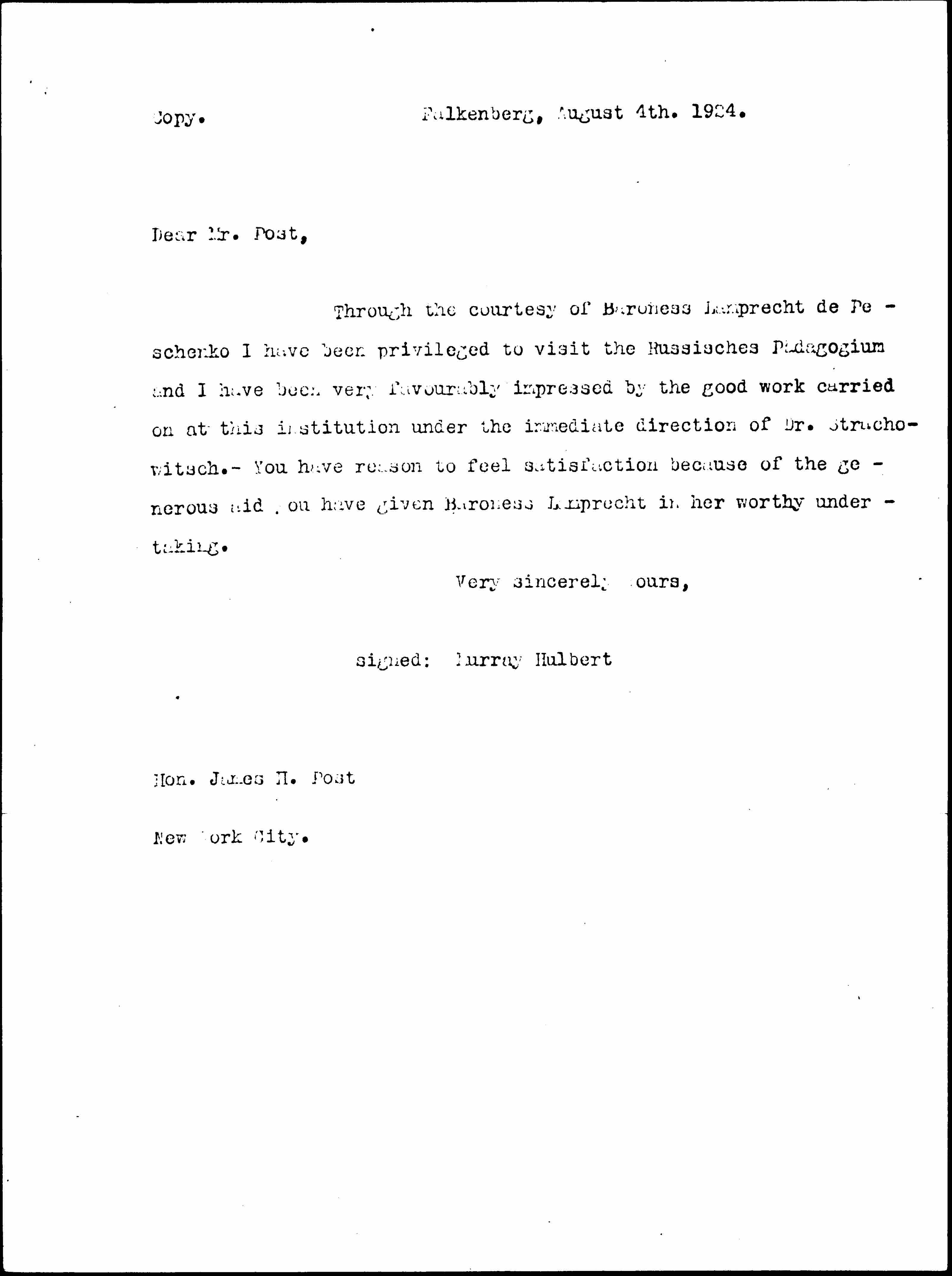 Through the courtesy of Baroness Lamprecht de [Petschenko] I have been privileged to visit the Russiches Pedagogium and I have been very favorably impressed by the good work carried on at this institution under the immediate direction of Dr. Strachovitsch. -- You have reason to feel satisfaction because of the generous aid you have given Baroness Lamprecht in her worthy undertaking.