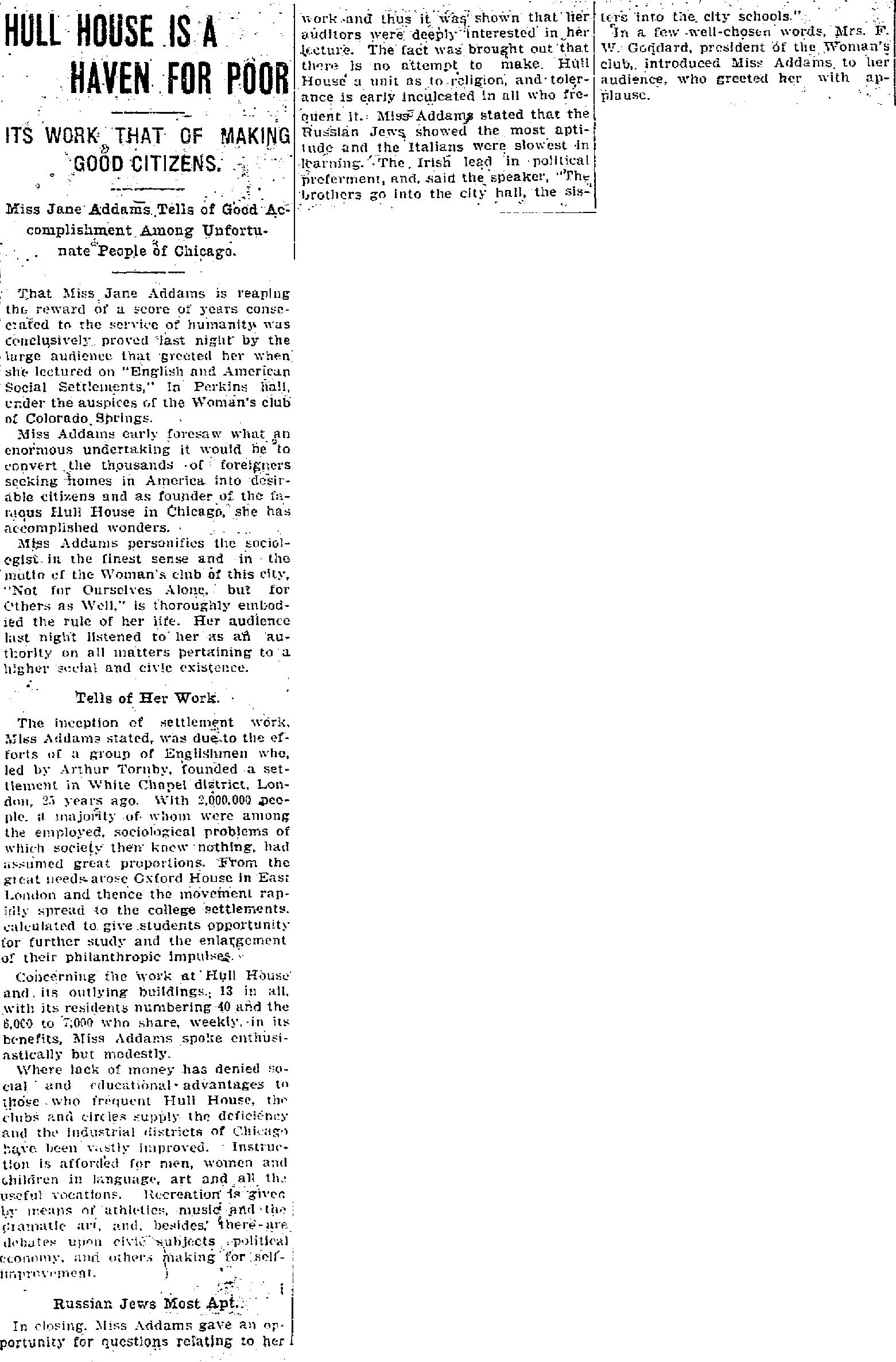 In closing, Miss Addams gave an opportunity for questions relating to her work and thus it was shown that her auditors were deeply interested in her lecture. The fact was brought out that there is no attempt to make Hull House a unit as to religion, and tolerance is early inculcated in all who frequent it. Miss Addams stated that the Russian Jews showed the most aptitude and the Italians were slowest in learning. The Irish lead in political preferment, and, said the speaker, "The brothers go into the city hall, the sisters into the city schools."