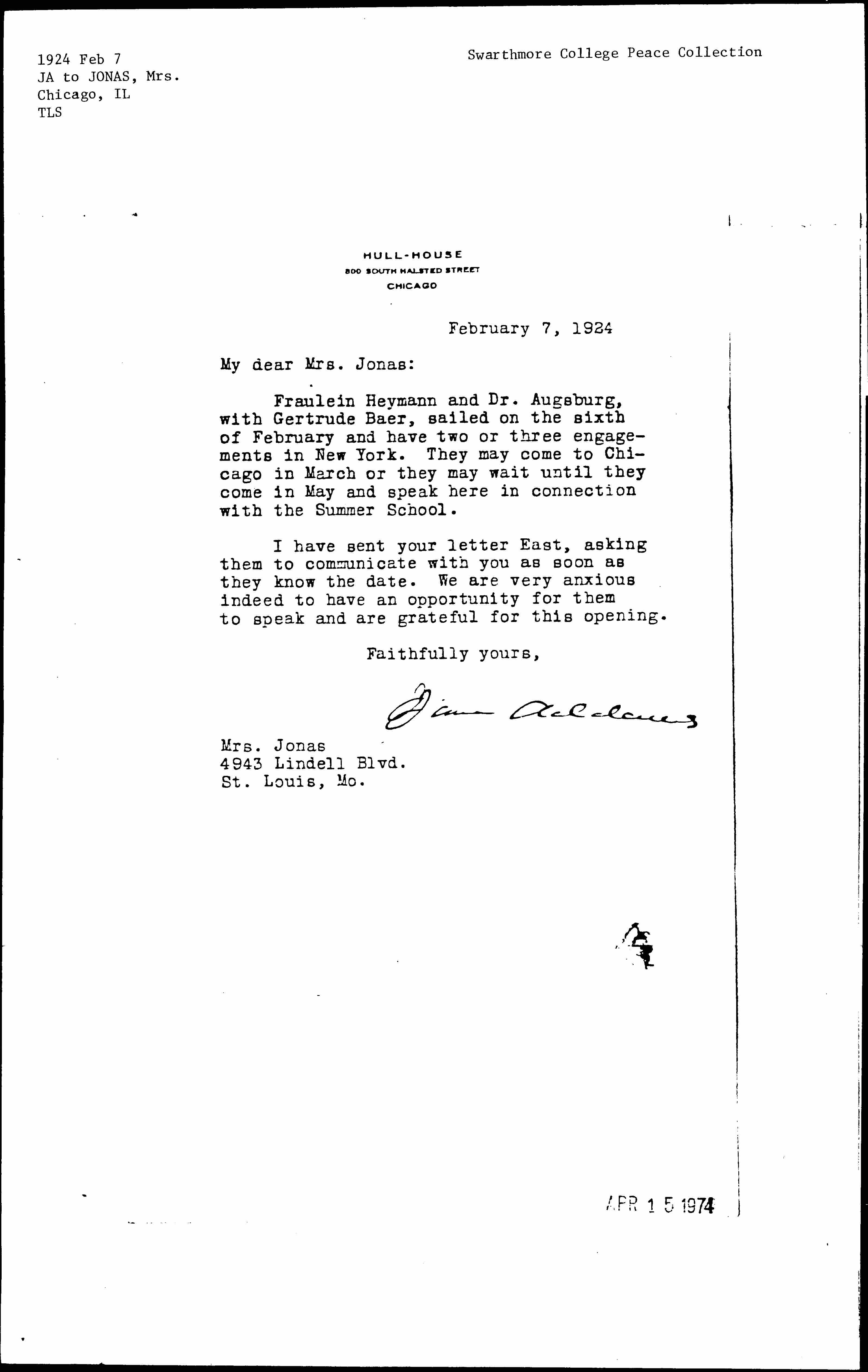 Fraulein Heymann and Dr. [Augspurg], with [Gertrud] Baer, sailed on the sixth of February and have two or three engagements in New York. They may come to Chicago in March or they may wait until they come in May and speak in here connection with the Summer School.