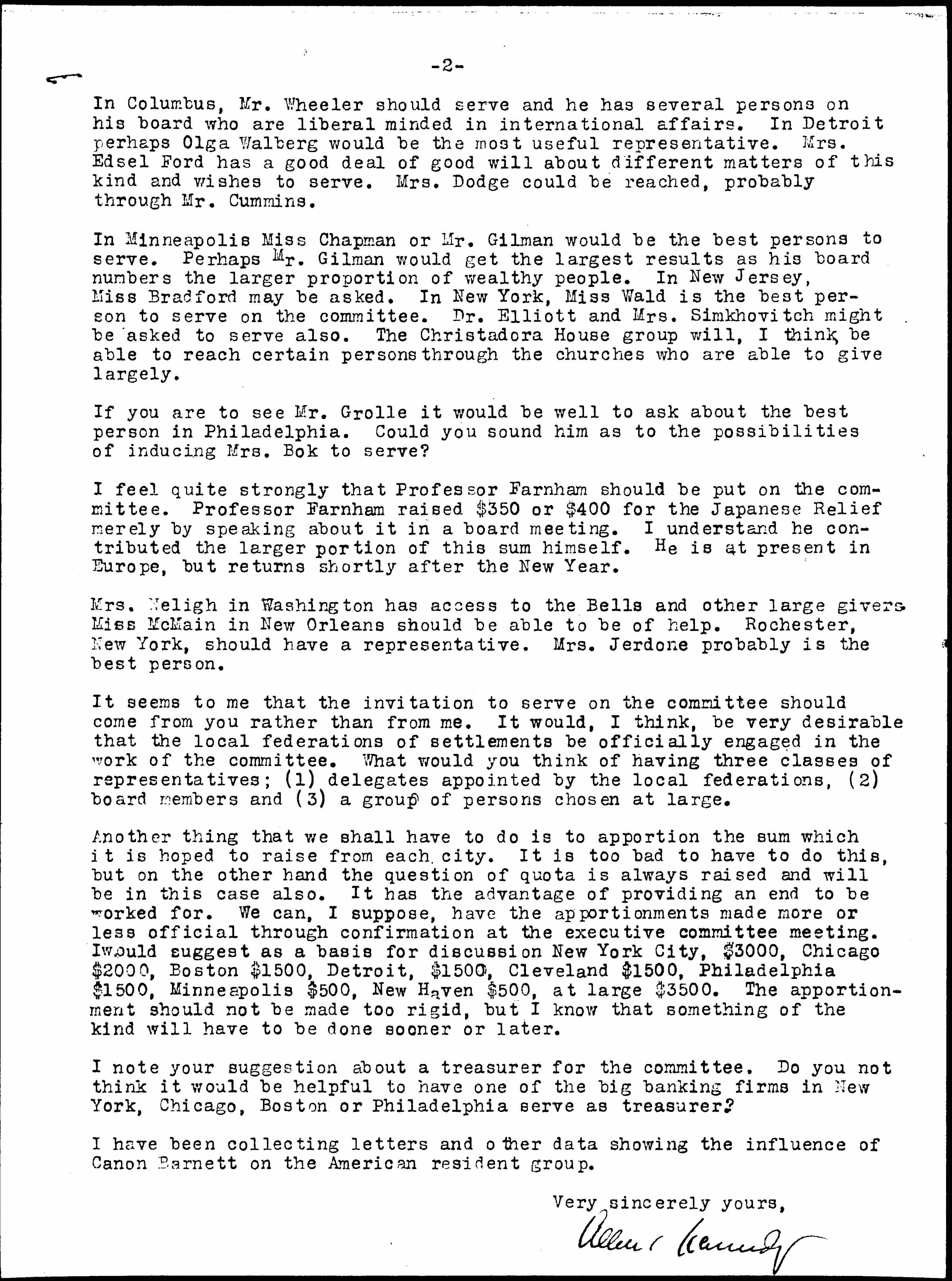 In Minneapolis Miss Chapman or Mr. Gilman would be the best persons to serve. Perhaps Mr. Gilman would get the largest results as his board number the larger proportion of wealthy people. In New Jersey, Miss Bradford may be asked. In New York, Miss Wald is the best person to serve on the committee. Dr. Elliott and Mrs. Simkhovitch might be asked to serve also. The Christadora House group will, I think, be able to reach certain persons through the churches who are able to give largely.
