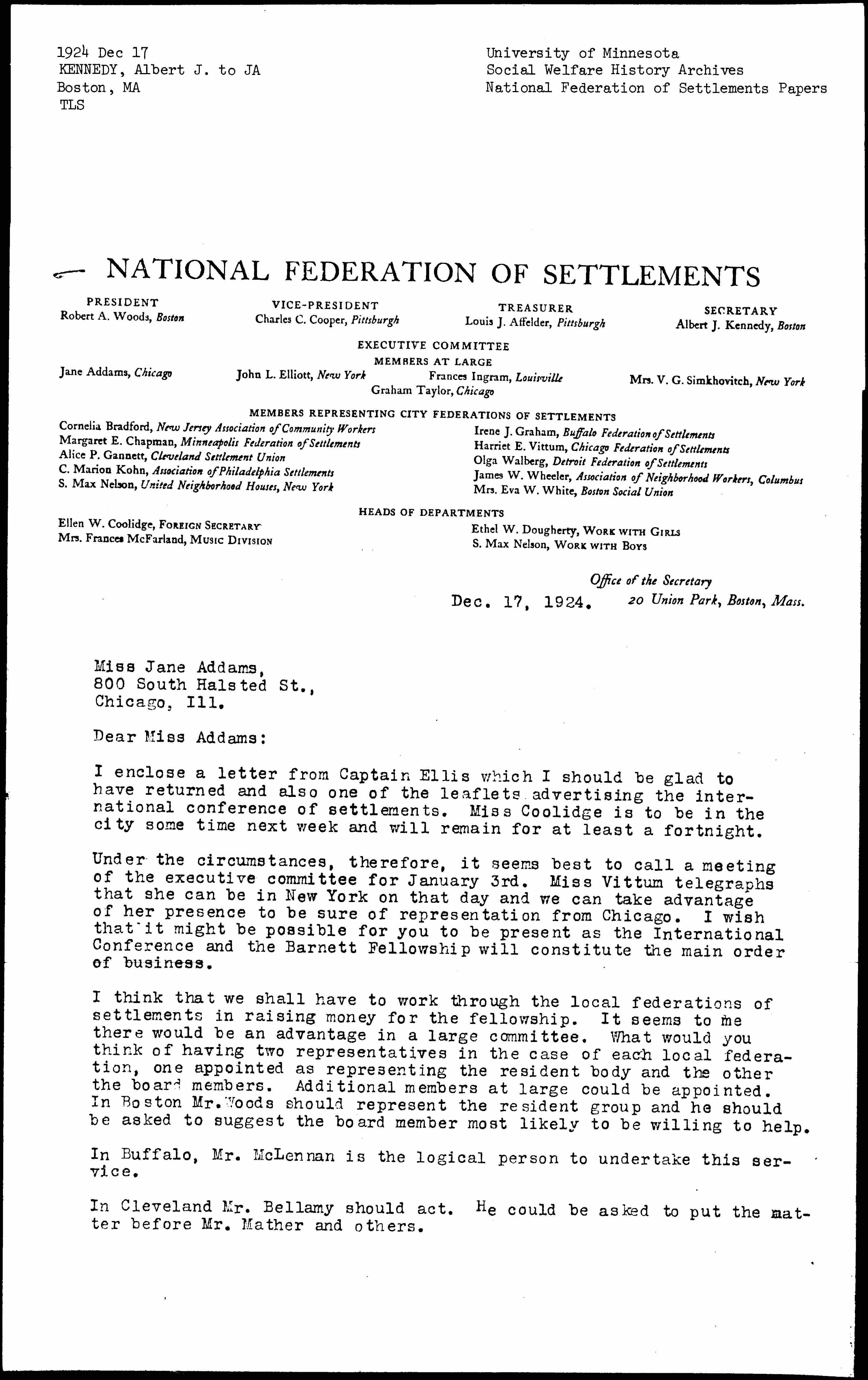 I think that we shall have to work through the local federations of settlements in raising money for the fellowship. It seems to me there would be an advantage in a large committee. What would you think of having two representatives in the case of each local federation, one appointed as representing the resident body and the other the board members. Additional members at large could be appointed. In Boston Mr. Woods should represent the resident group and he should be asked to suggest the board member most likely to be willing to help.