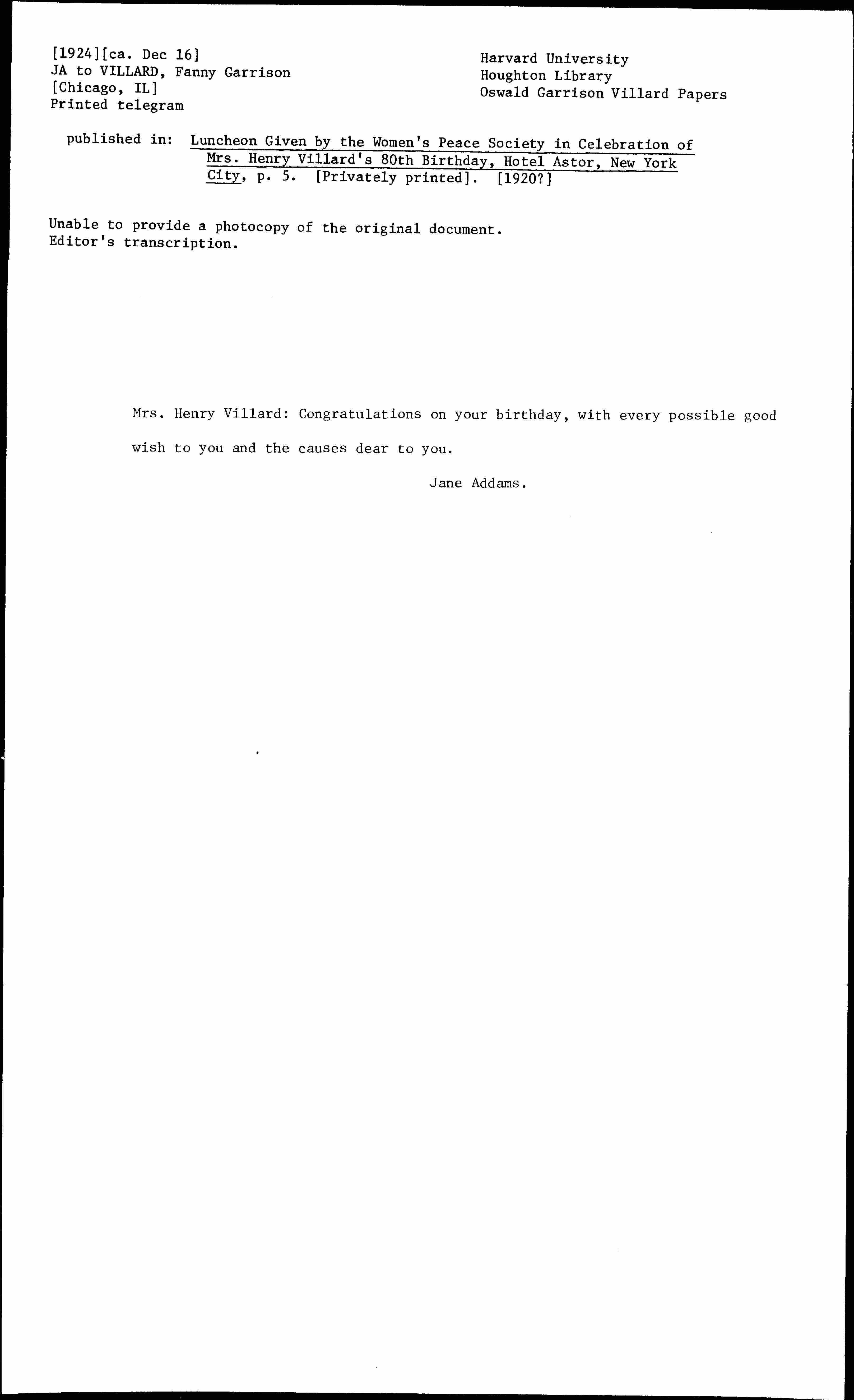 Mrs. Henry Villard: Congratulations on your birthday, with every possible good wish to you and the causes dear to you.