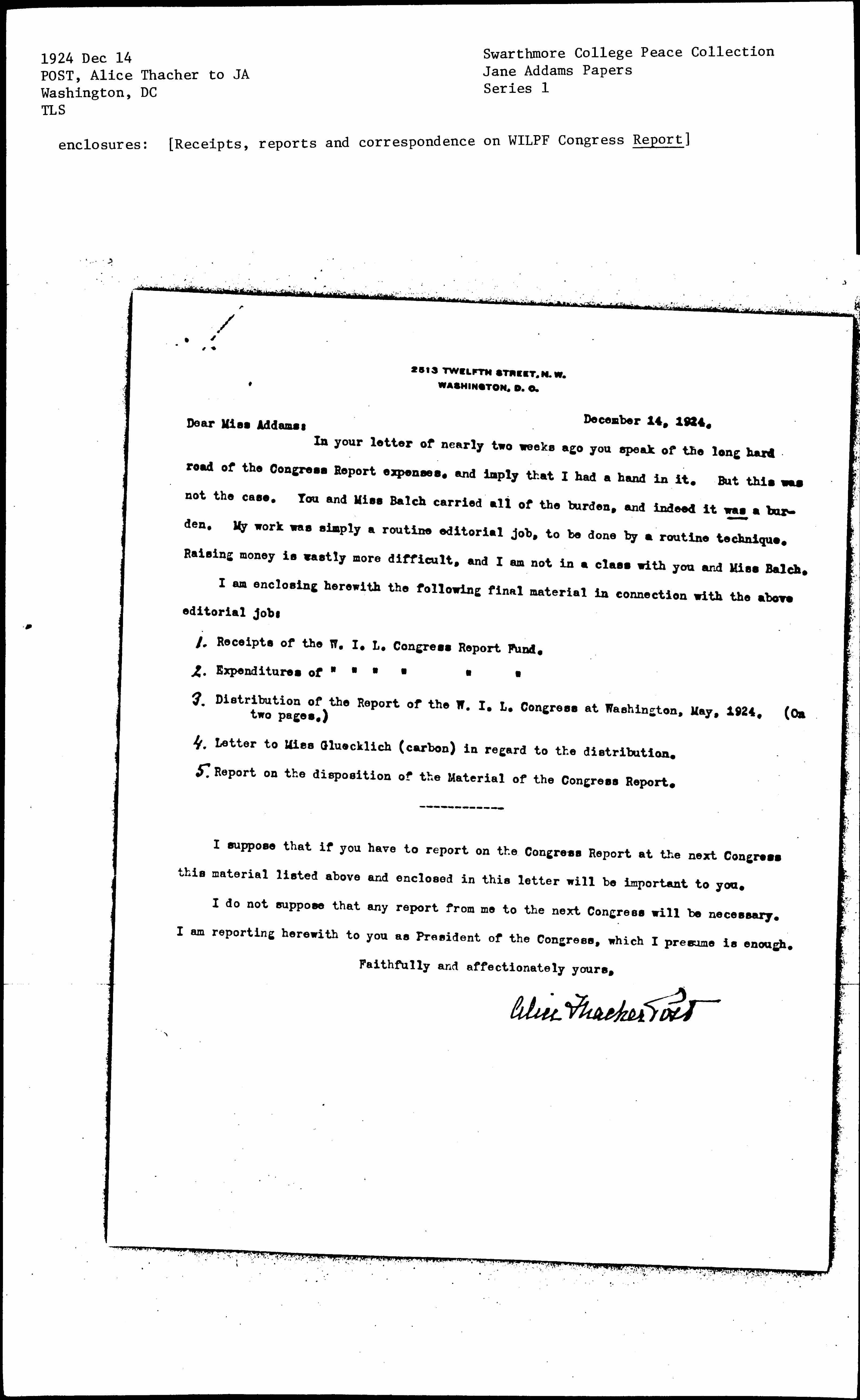↑3.↓ Distribution of the Report of the W.I.L. Congress at Washington, May, 1924. (On two pages.)