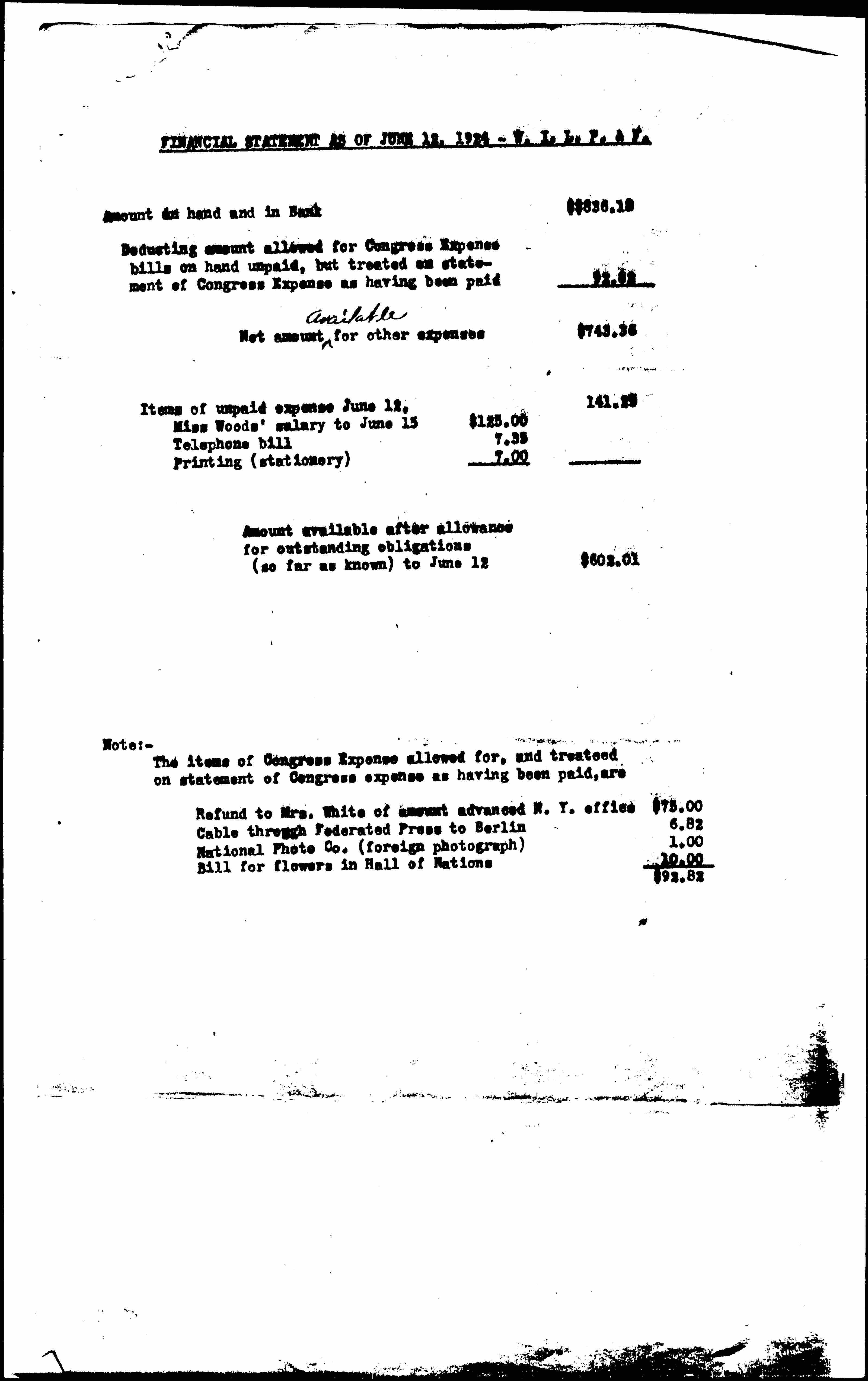 FINANCIAL STATEMENT AS OF JUNE 12, 1924 -- W.I.L.P.&F.