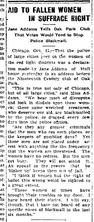 Jane Addams Tells Oak Park Club That Votes Would Tend to Stop Police Blackmail.