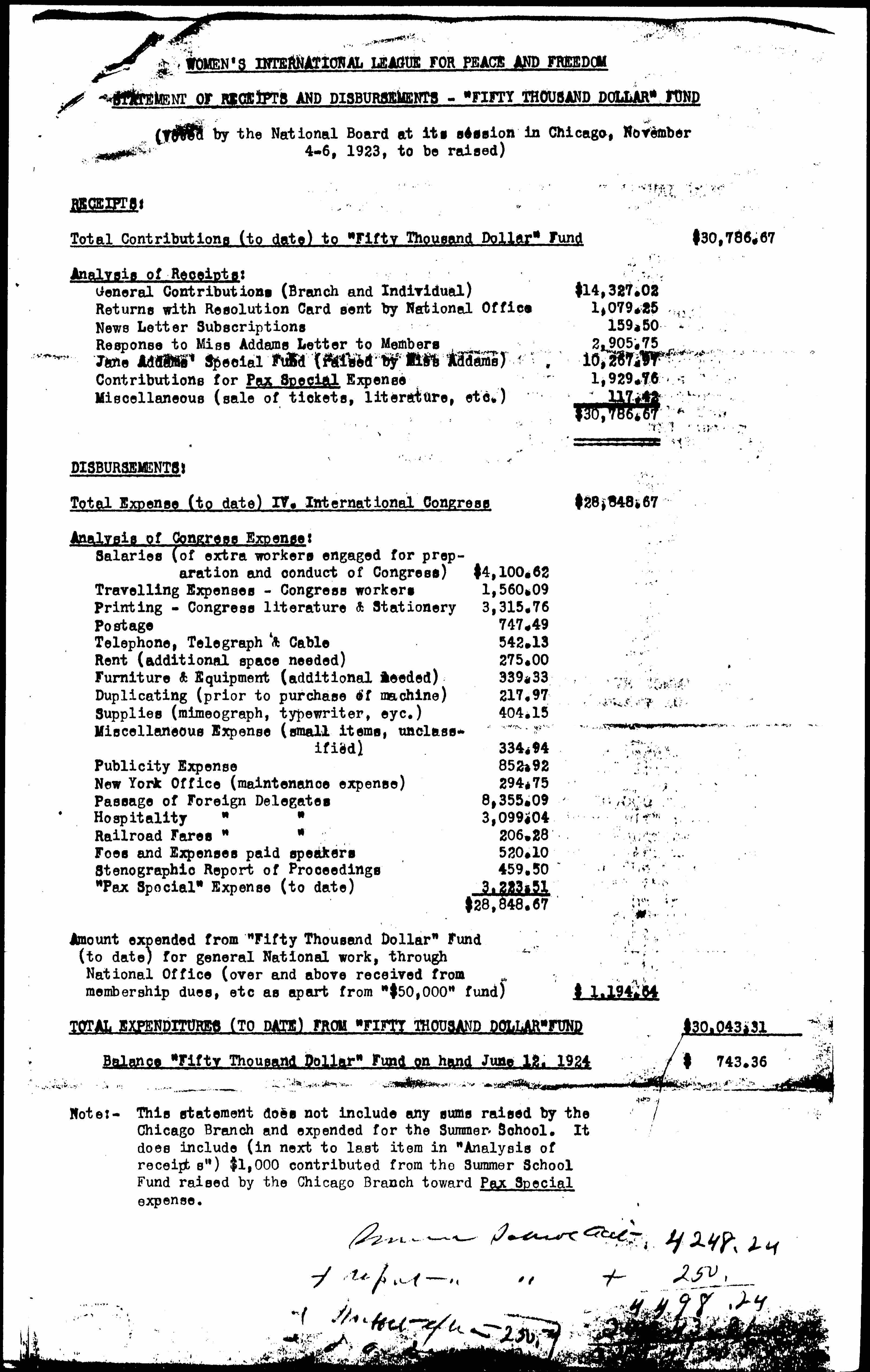 Note: -- This statement does not include any sums raised by the Chicago Branch and expended for the Summer School. It does include (in next to last item in "Analysis of receipts") $1,000 contributed from the Summer School Fund raised by the Chicago Branch toward Pax Special expense.