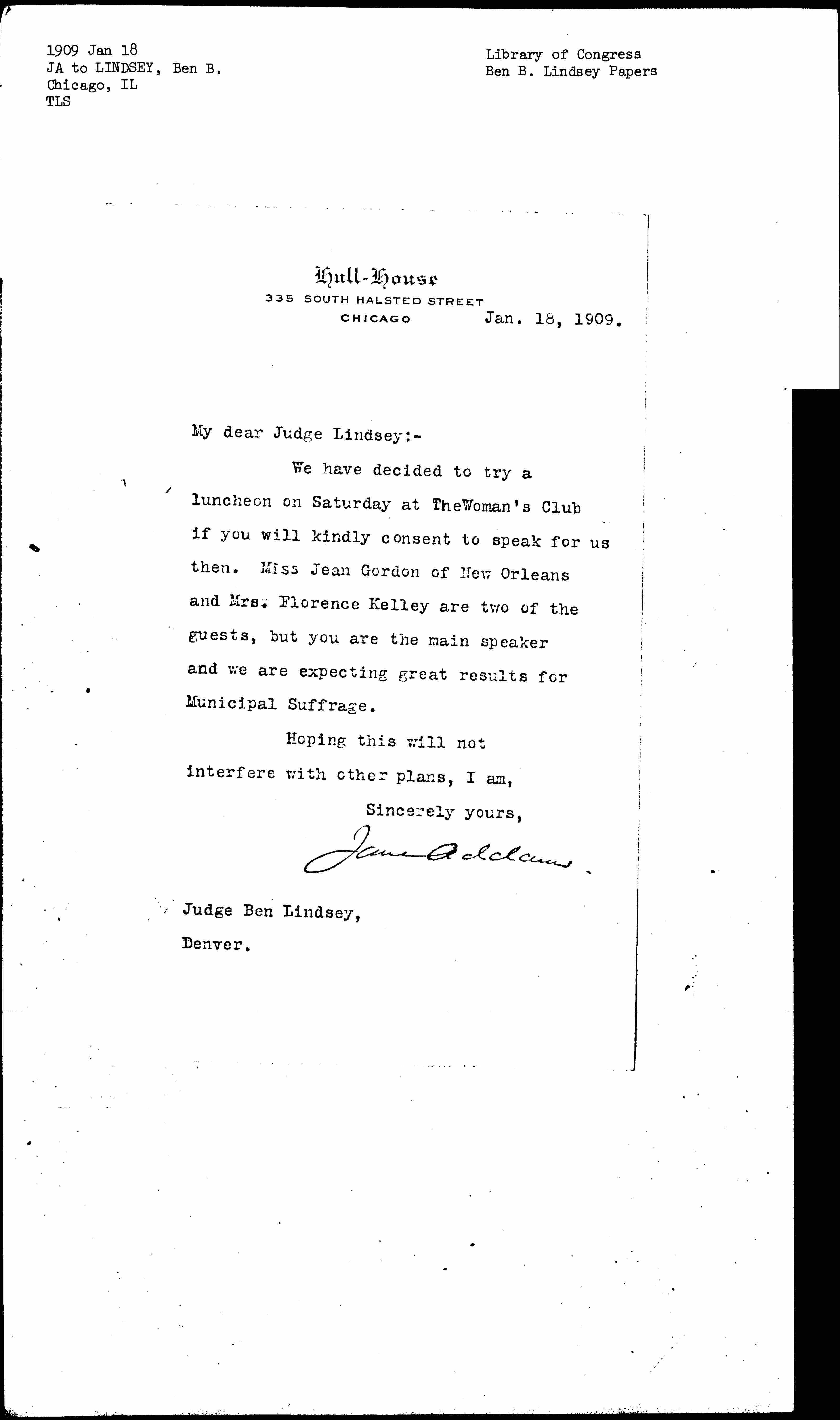 We have decided to try a luncheon on Saturday at the The Woman's Club if you will kindly consent to speak for us then. Miss Jean Gordon of New Orleans and Mrs. Florence Kelley are two of the guests, but you are the main speaker and we are expecting great results for the Municipal Suffrage.