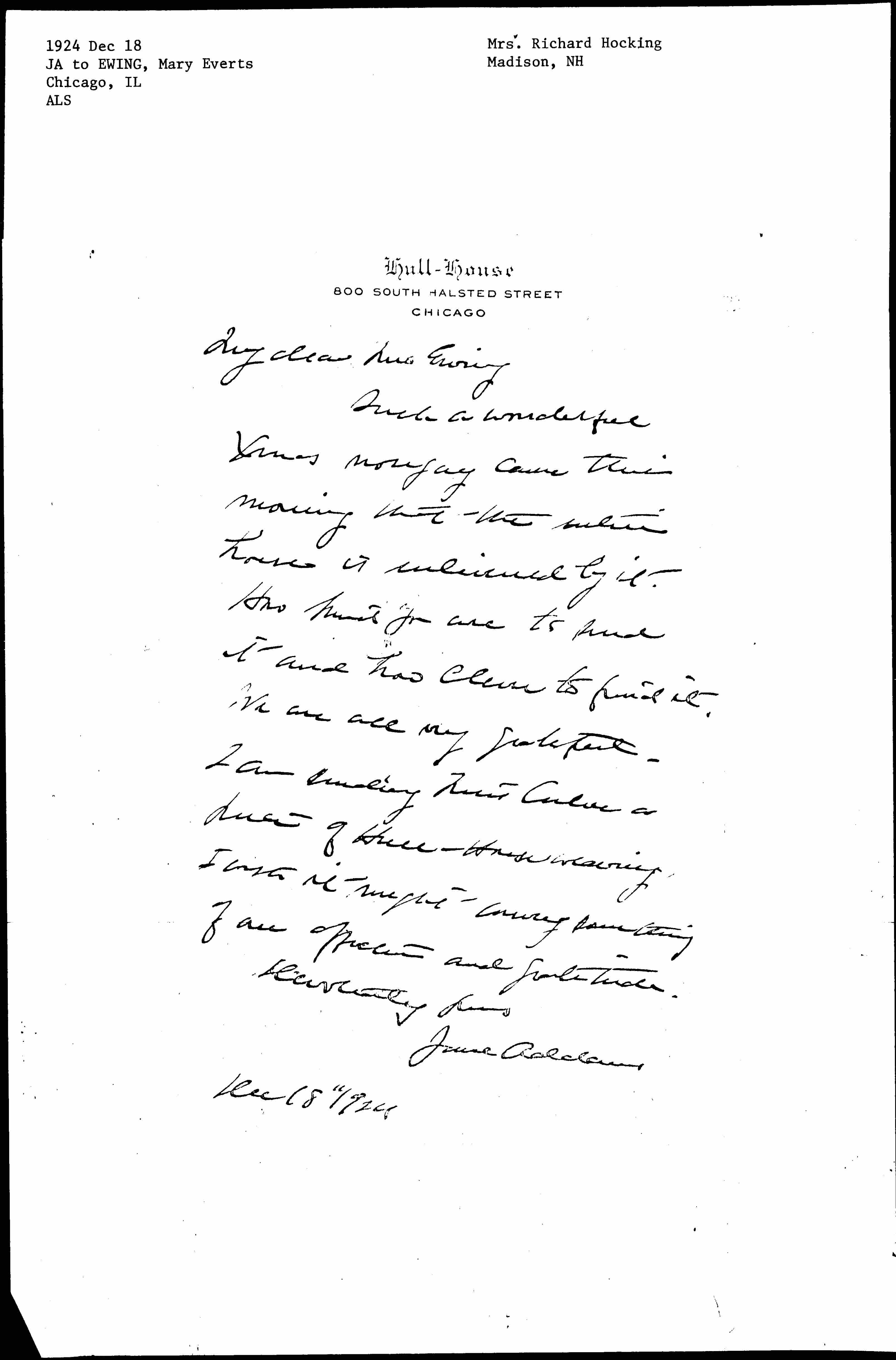Such a wonderful Xmas nosegay came this morning that the entire house is enlivened by it. How kind you are to send it and how clever to find it. We are all very grateful. I am sending Miss Culver a piece of Hull-House weaving. I wish it might convey something of our affection and gratitude.
