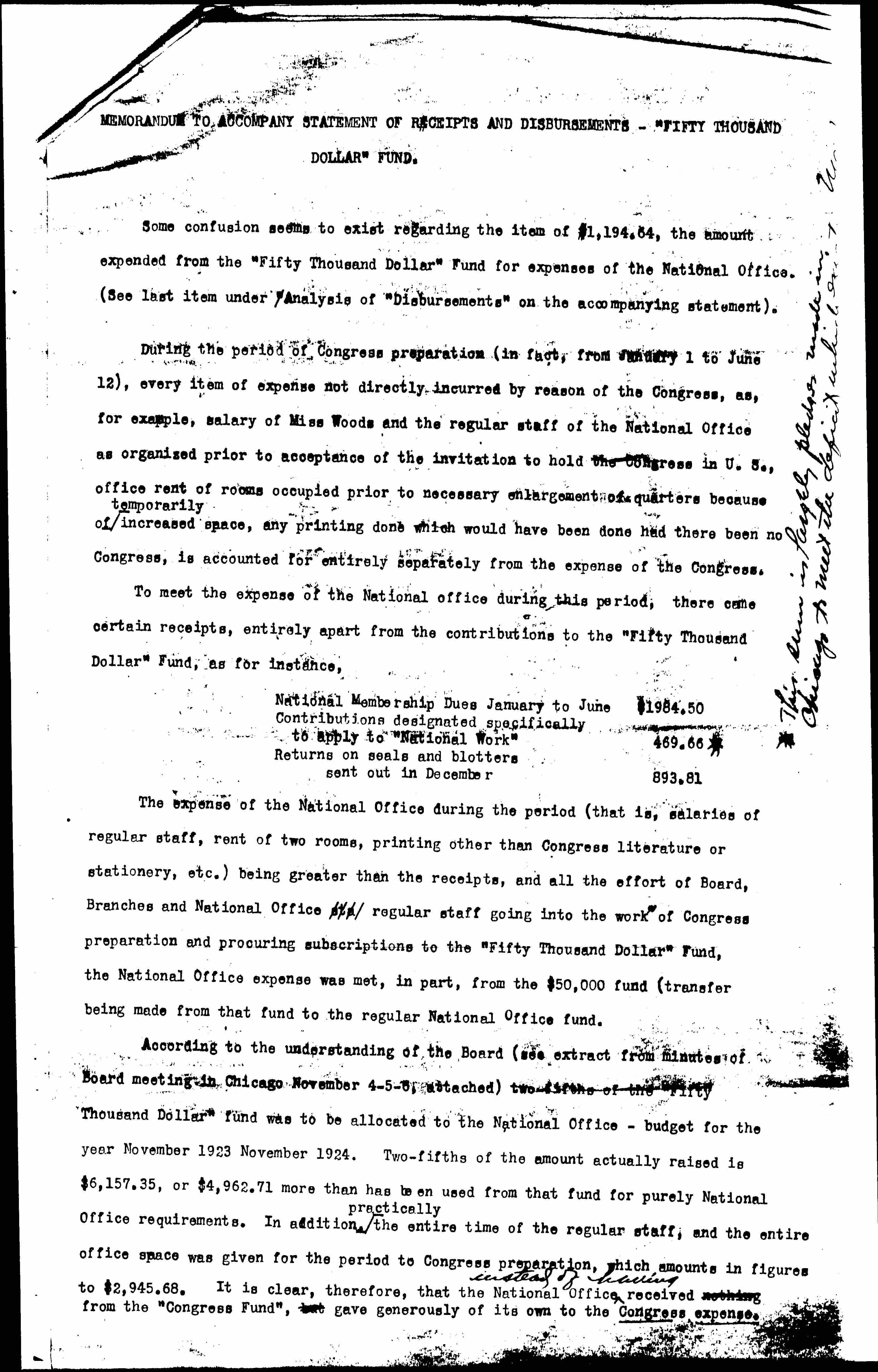 According to the understanding of the Board (see extract from minutes of Board meeting in Chicago November 4-5-6, attached) two fifths of the "Fifty Thousand Dollar" fund was to be allocated to the National Office -- budget for the year November 1923 November 1924. Two-fifths of the amount actually raised is $6,157.35, or $4,962.71 more than has been used from that fund for purely National Office requirements. In addition, ↑practically↓ the entire time of the regular staff, and the entire office space was given for the period to Congress preparation, which amounts in figures to $2,945.68. It is clear, therefore, that the National Office ↑instead of having↓ received nothing from the "Congress Fund," but gave generously of its own to the Congress expense.↑