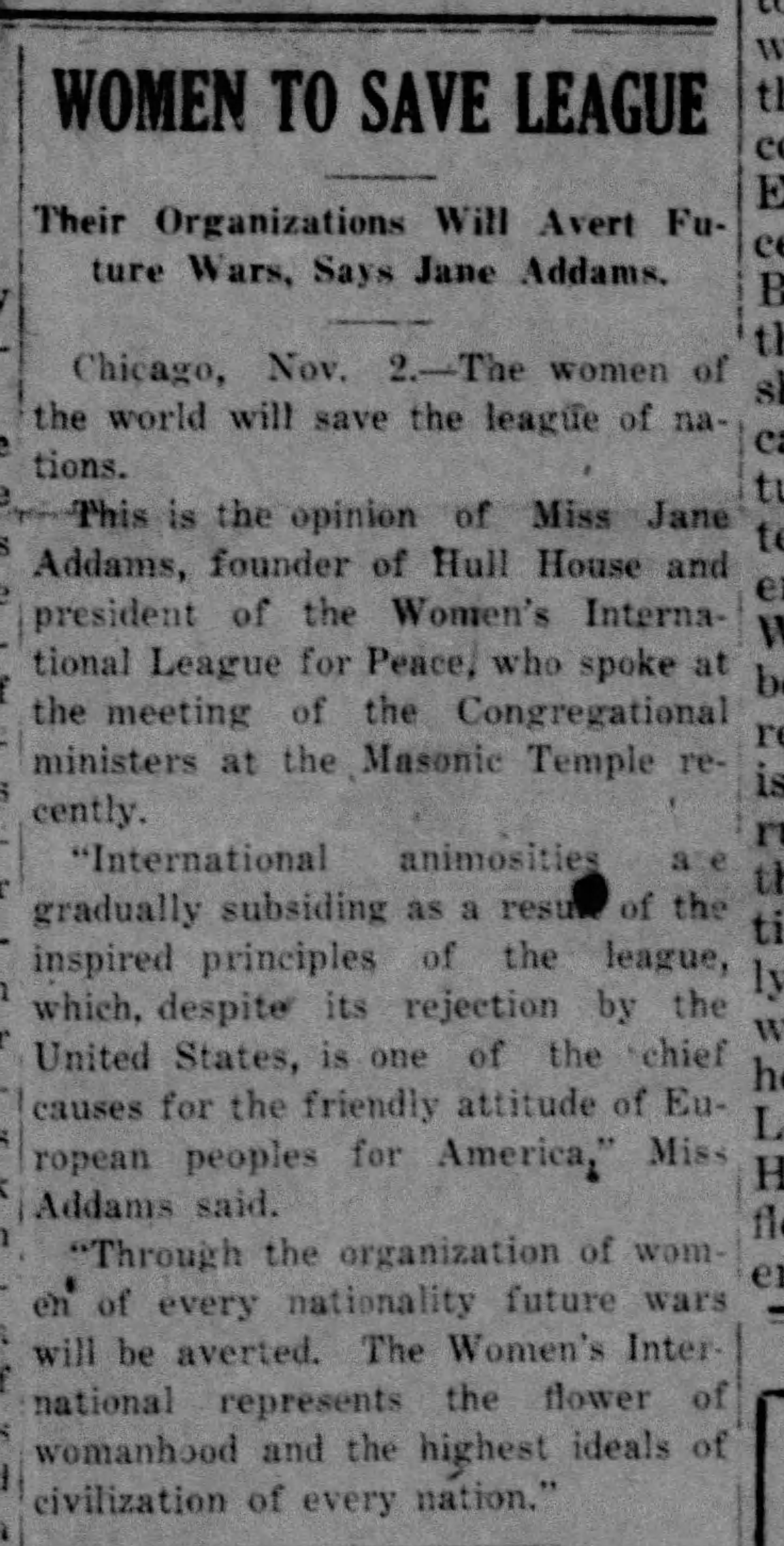 Their Organizations Will Avert Future Wars, Says Jane Addams.