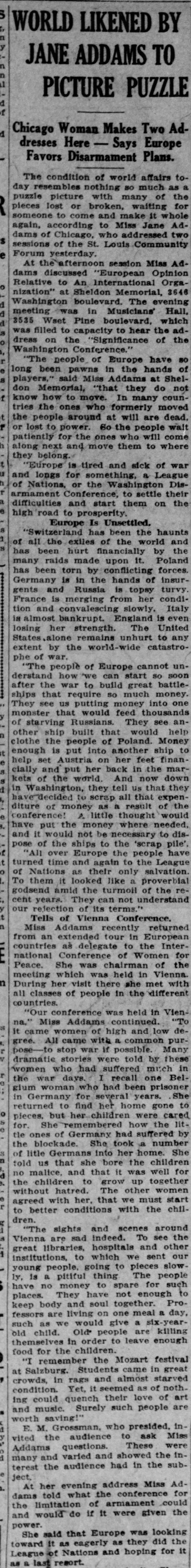 At the afternoon session Miss Addams discussed "European Opinion Relative to an International Organization" at Sheldon Memorial, 3646 Washington boulevard. The evening meeting was in Musicians' Hall, 3535 West Pine boulevard, which was filled to capacity to hear the address on the "Significance of the Washington Conference."