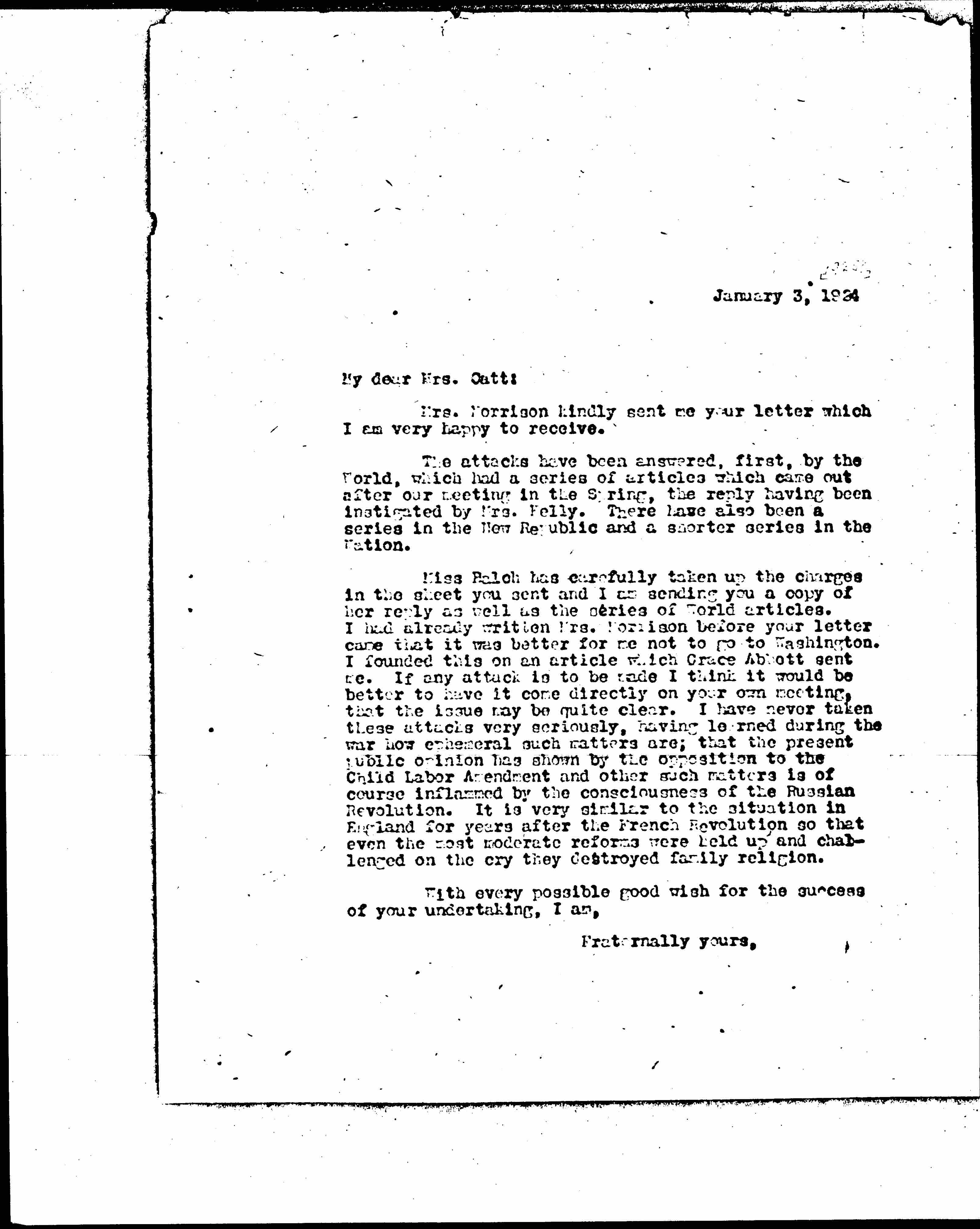 Miss Balch has carefully take up the charges in the sheet you sent and I am sending you a copy of her reply as well as the series of World articles. I had already written Mrs. [Morrisson] before your letter came that it was better for me not to go to Washington. I founded this on an article which Grace Abbott sent me. If any attack is to be made I think it would be better to have it come directly on you own meeting, that the issue may be quite clear. I have never taken these attacks very seriously, having learned during the war how ephemeral such matters are; that the present public opinion has shown by the opposition to the Child Labor Amendment and other such matters is of course [inflamed] by the consciousness of the Russian Revolution. It is very similar to the situation in England for years after the French Revolution so that even the most moderate reforms were held up and challenged on the cry they destroyed family religion.