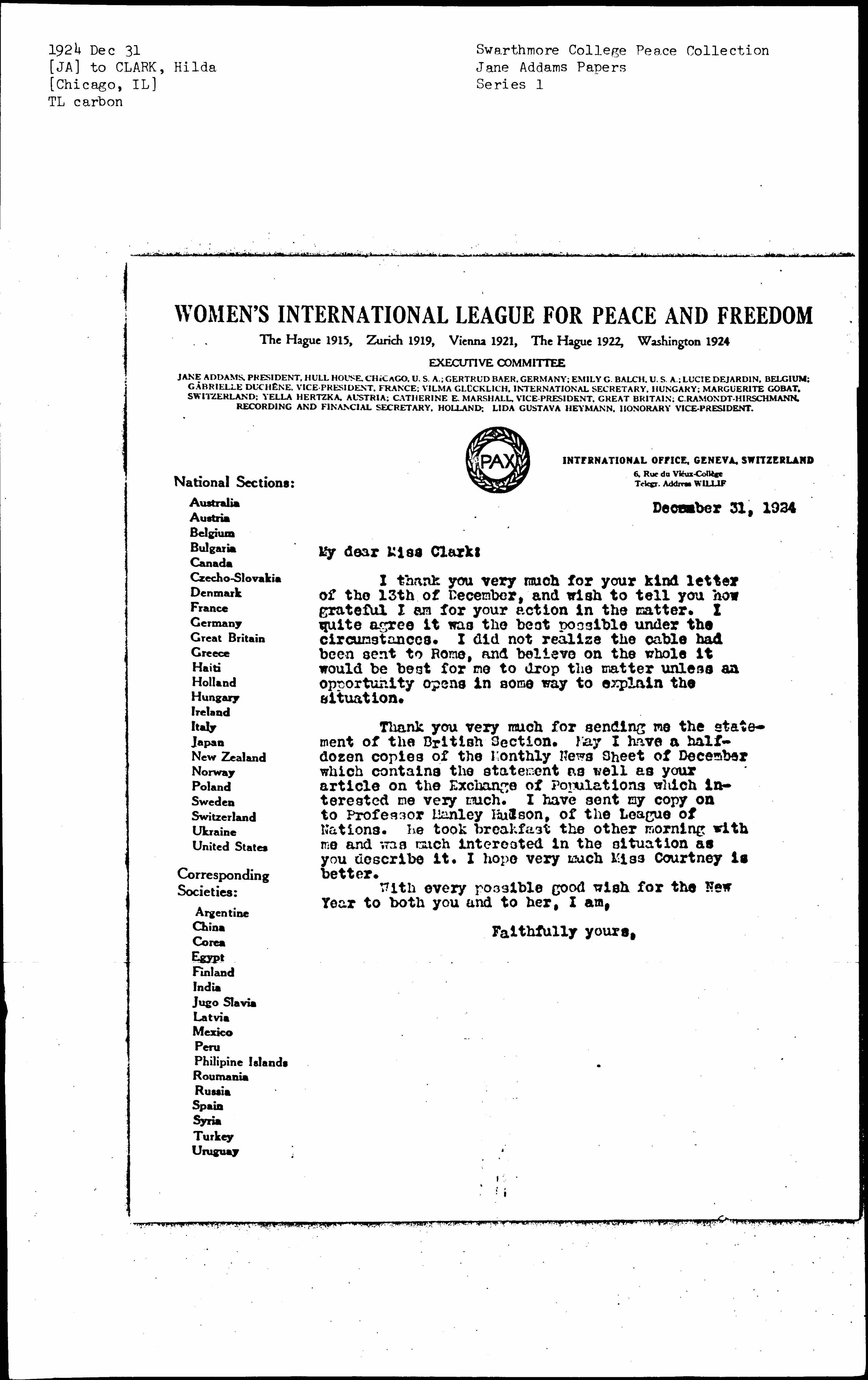 Thank you very much for sending me the statement of the British Section. May I have a half-dozen copies of the Monthly News Sheet of December which contains the statement as well as your article on the Exchange of Populations which interested me very much. I have sent my copy on to Professor Manley Hudson, of the League of Nations. He took breakfast the other morning with me and was much interested in the situation as you describe it. I hope very much Miss Courtney is better.