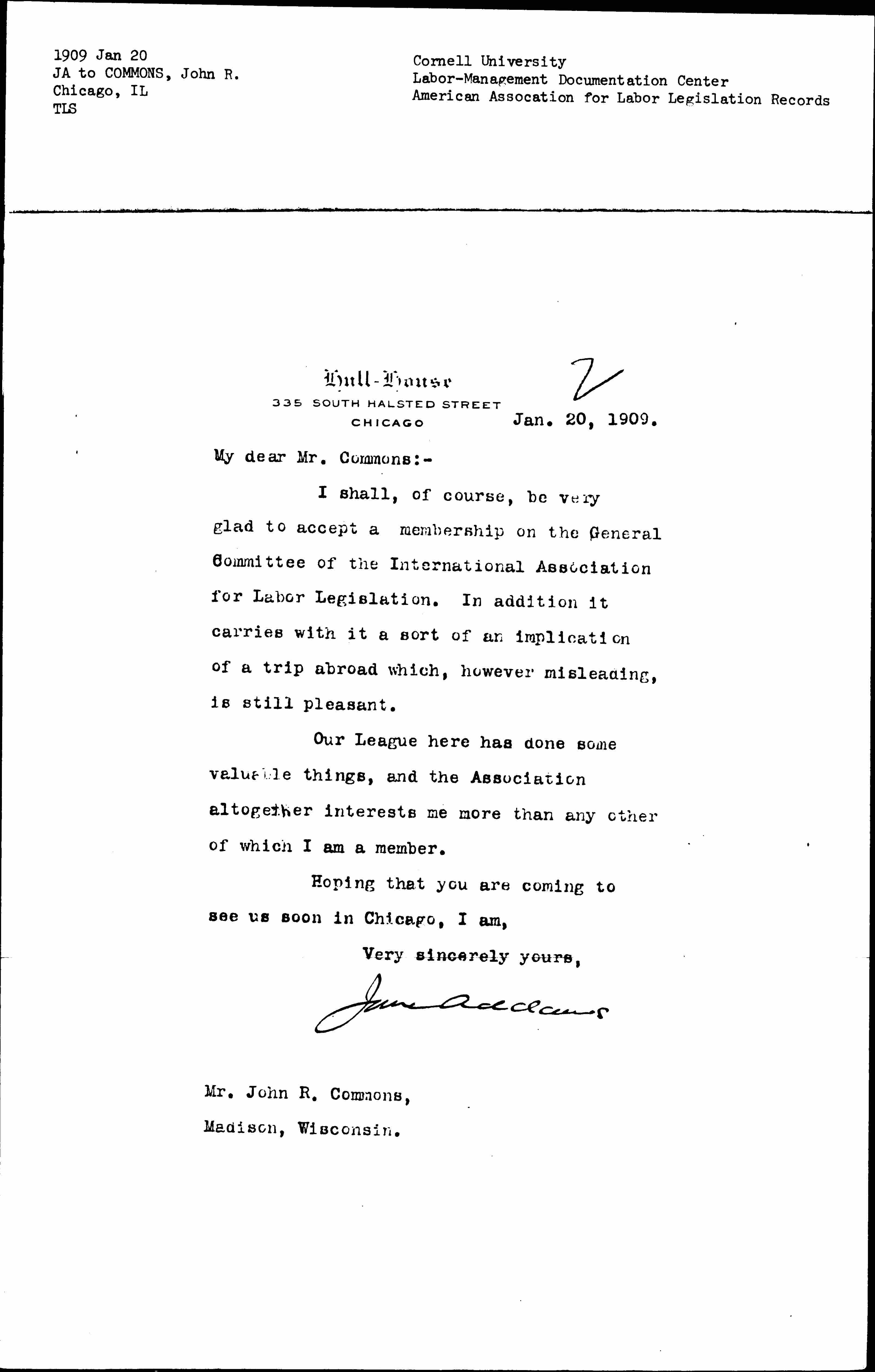 I shall, of course, be very glad to accept a membership on the General Committee of the International Association for Labor Legislation. In addition it carries with it a sort of an implication of a trip abroad which, however misleading, is still pleasant.