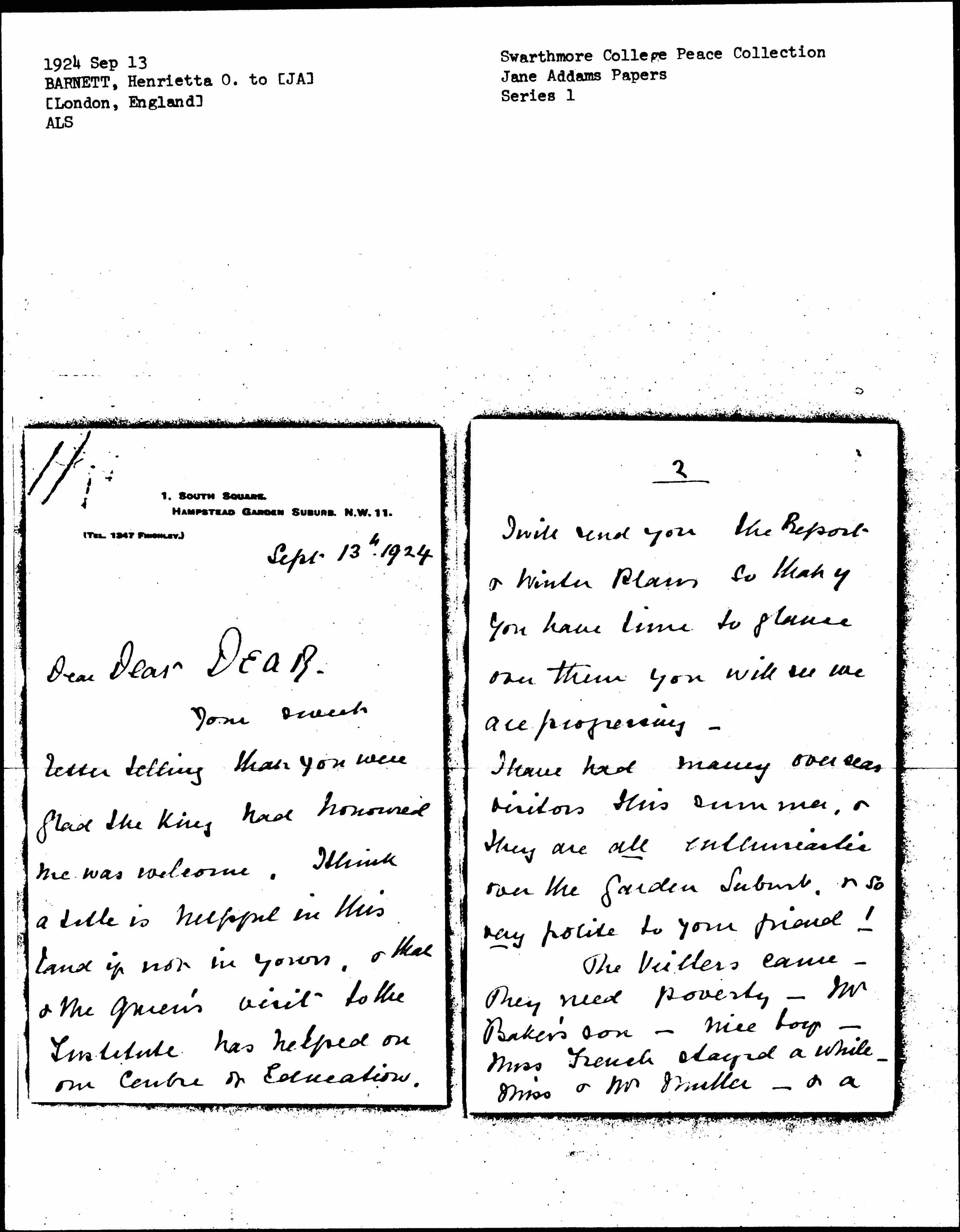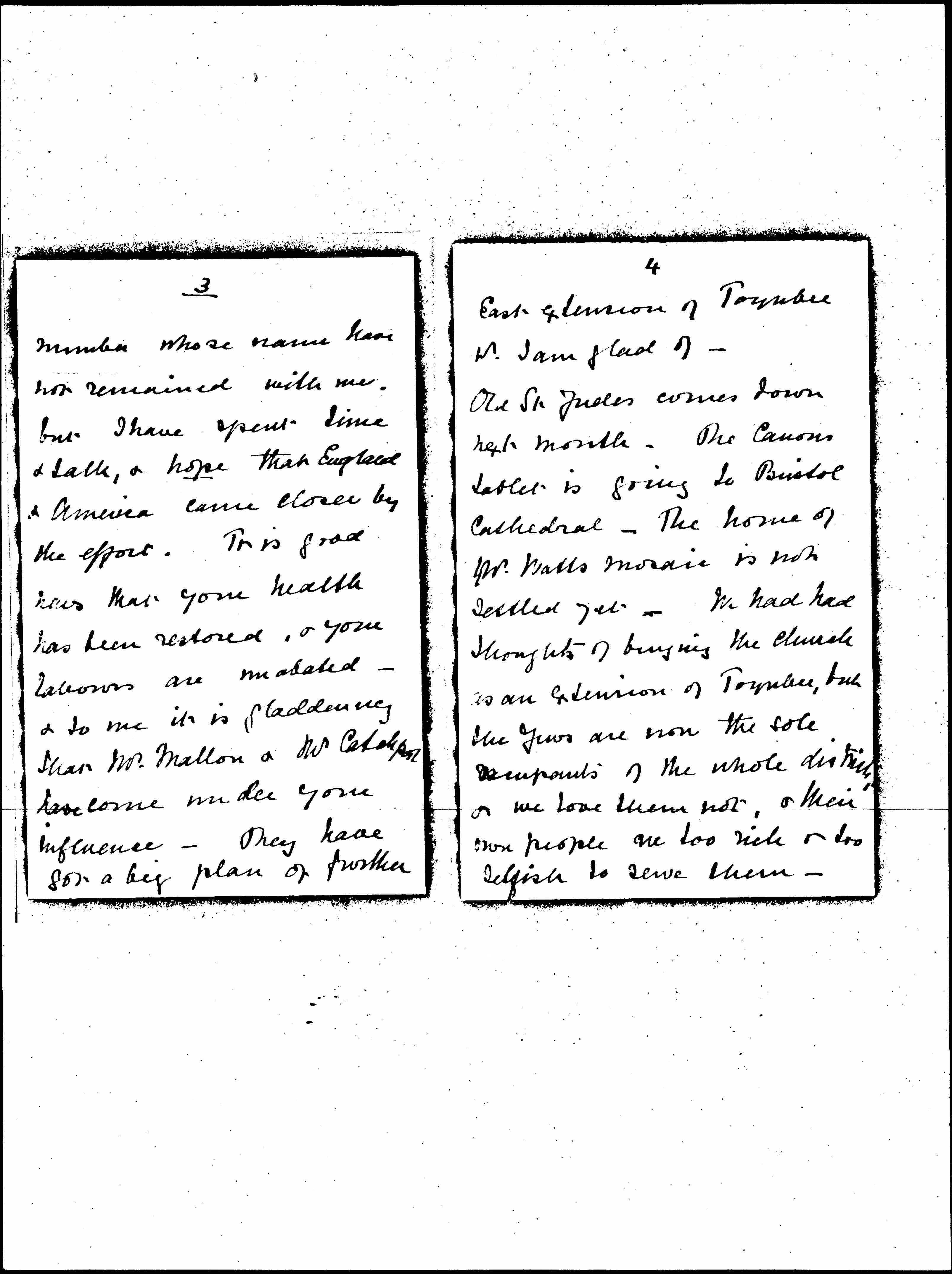 The [Veillers] came -- they need poverty -- Mr Baker's son -- nice boy -- Miss French stayed a while -- Miss & Mr Muller -- & a [page 3] member whose name has not remained with me, but I have spent time & talk, & hope that England & America came closer by the effort. It is good news that your heath has been restored, & your [labors] are unabated -- & to me it is gladdening I have Mr Mallon & Mr Catchpool have come under your influence. They have got a big plan of further [page 4] East extension of Toynbee wh I am glad of.
