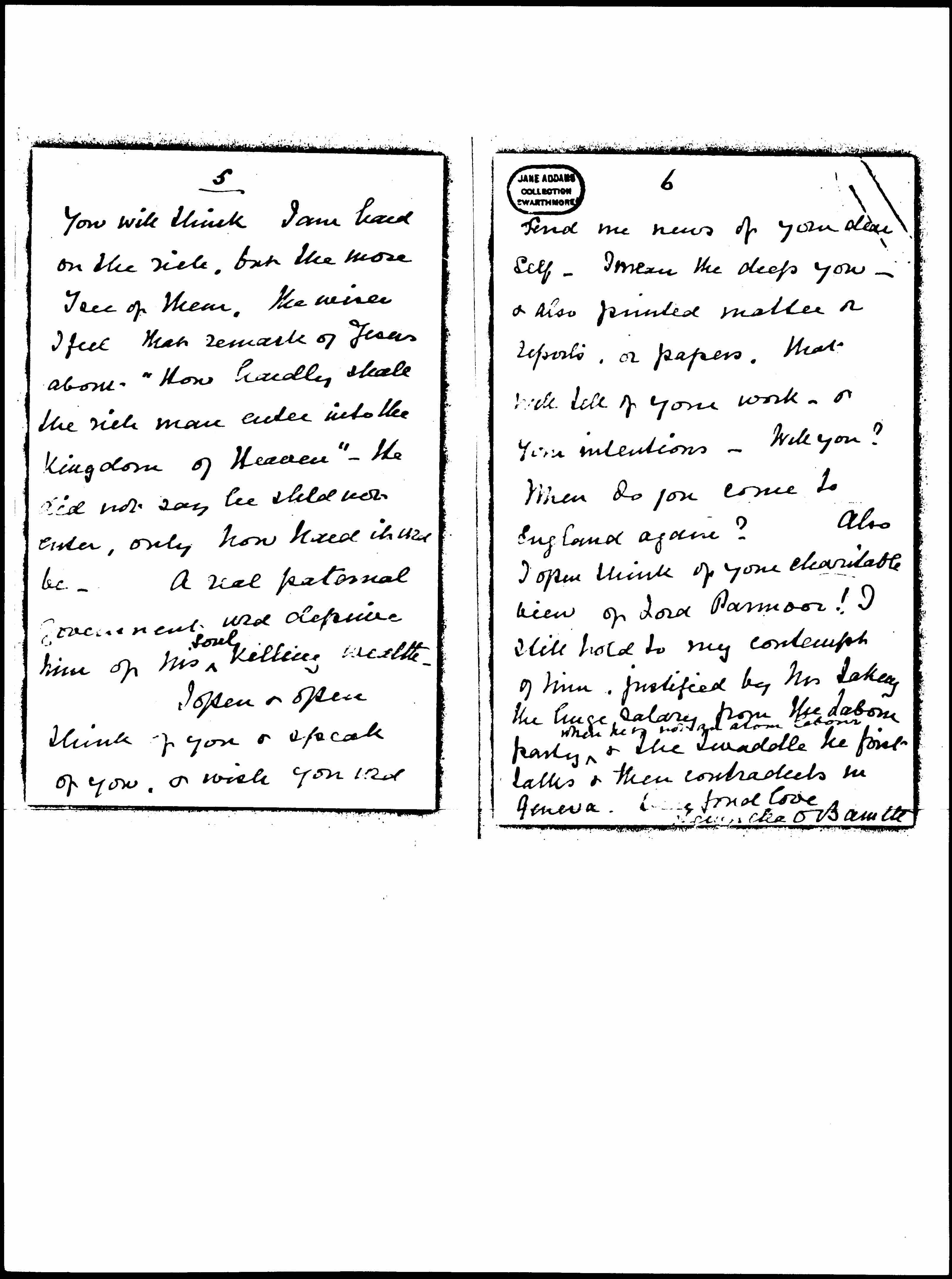 I often & often think of you & speak of you, & wish you wld [page 6] send me news of your dear self -- I mean the deep you -- & also printed matter or reports, or papers, that will tell of your work -- or your intentions -- Will you? When do you come to England again? Also I often think of your charitable view of Lord Parmoor! I still hold to my contempt of him, justified by Mr [Lakey?] the huge salary from the Labour Party ↑when he is not [illegible] [labor]↓ & the twaddle he first talks & then contradicts in Geneva. [Sending?] fond love