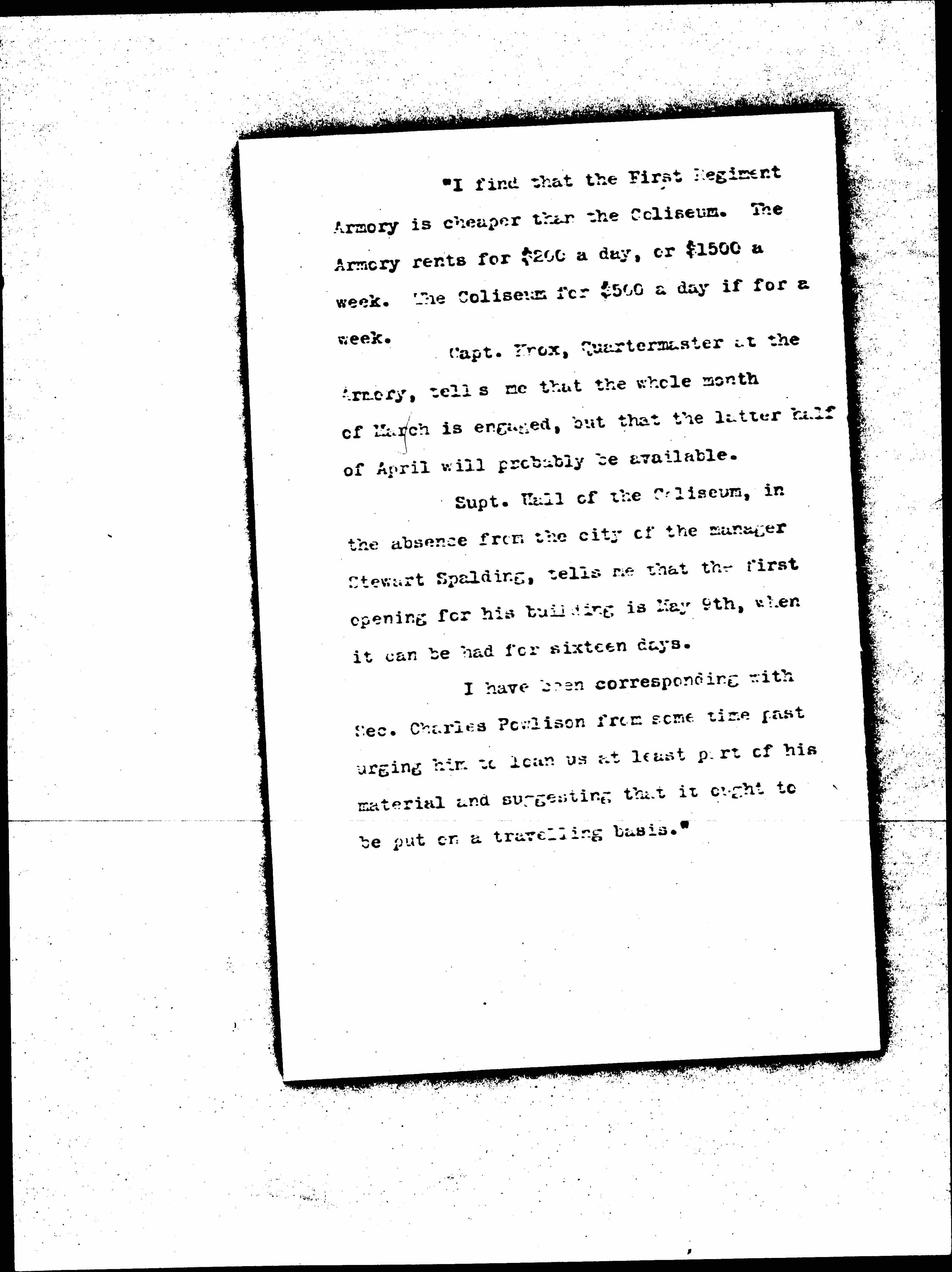 "I find that the First Regiment Armory is cheaper than the Coliseum. The Armory rents for $200 a day, or $1500 a week. The Coliseum for $500 a day if for a week.