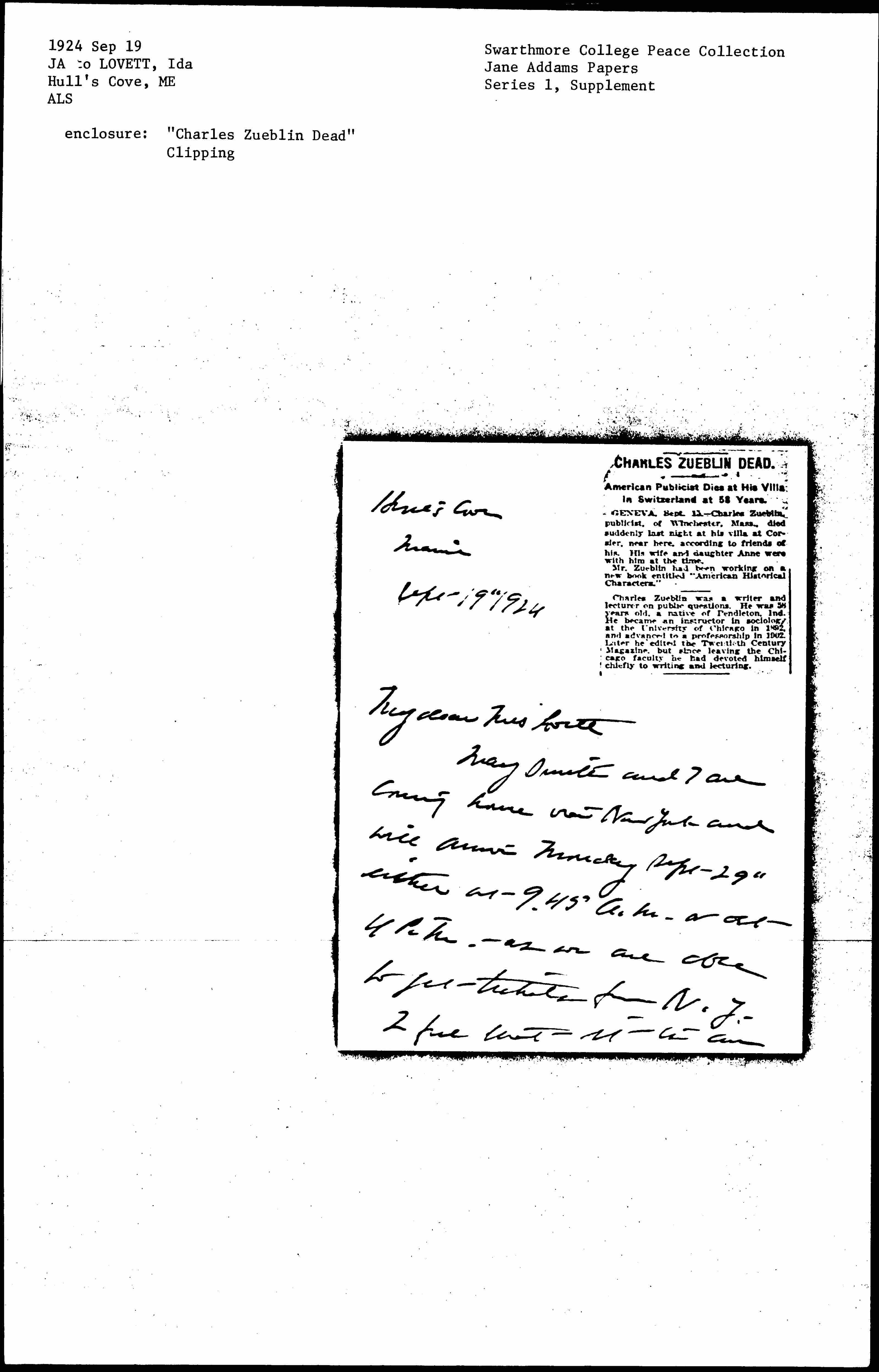Charles Zueblin was a writer and lecturer on public questions. He was 58 years old, a native of Pendleton, Ind. He became an instructor in sociology at the University of Chicago in 1892, and advanced to a professorship in 1902. Later he edited the Twentieth Century Magazine, but since leaving the Chicago faculty he devoted himself chiefly to writing and lecturing.