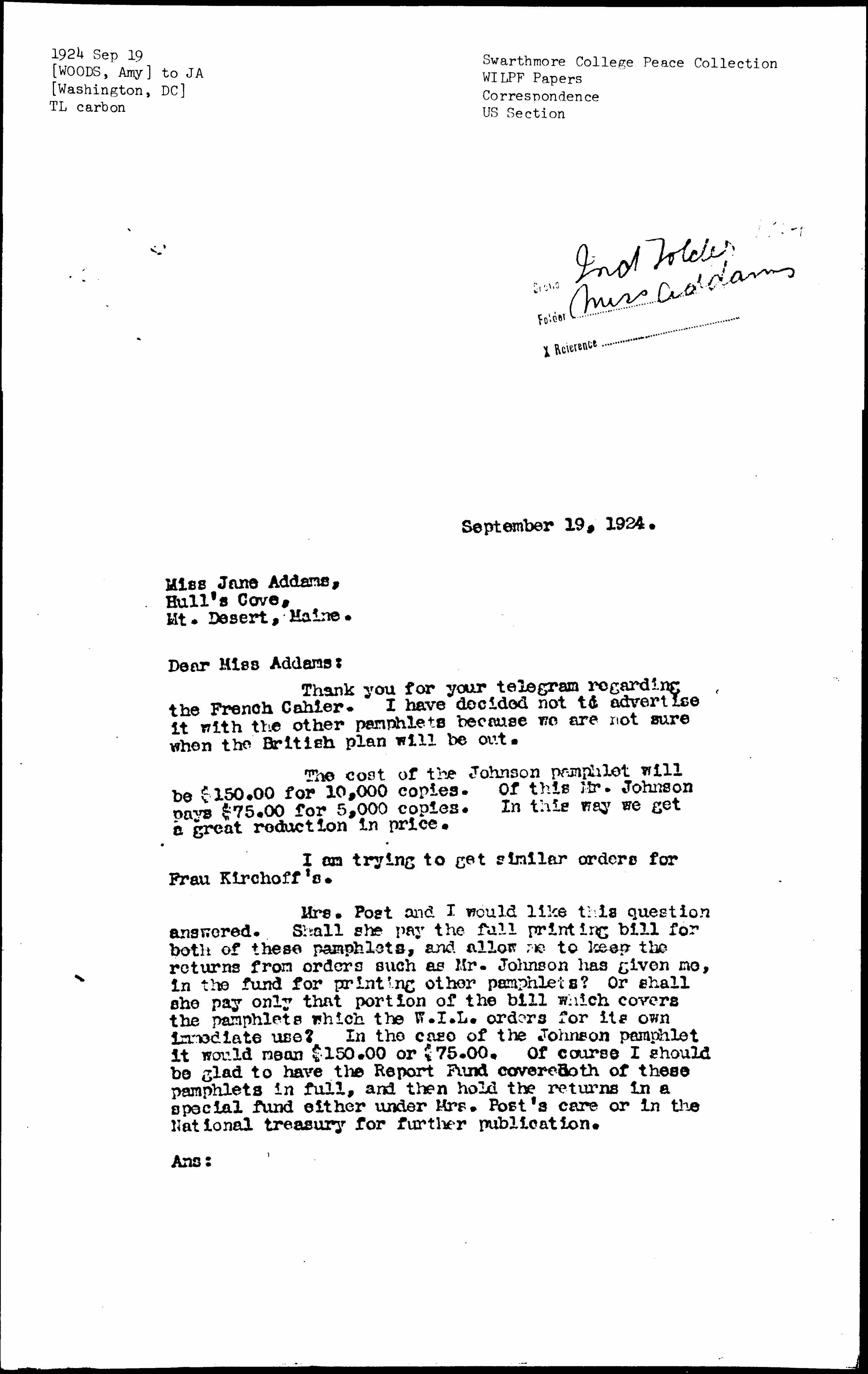 Mrs. Post and I would like this question answered. Shall she pay the full printing bill for both of these pamphlets, and allow me to keep the returns from orders such as Mr. Johnson has given me, in the fund for printing other pamphlets? Or shall she pay only that portion of the bill which covers the pamphlets which the W.I.L. orders for its own immediate use? In the case of the Johnson pamphlet it would mean $150.00 or $75.00. Of course I should be glad to have the Report Fund cover both of these pamphlets in full, and then hold the returns in a special fund either under Mrs. Post's care or in the National treasury for further publication.