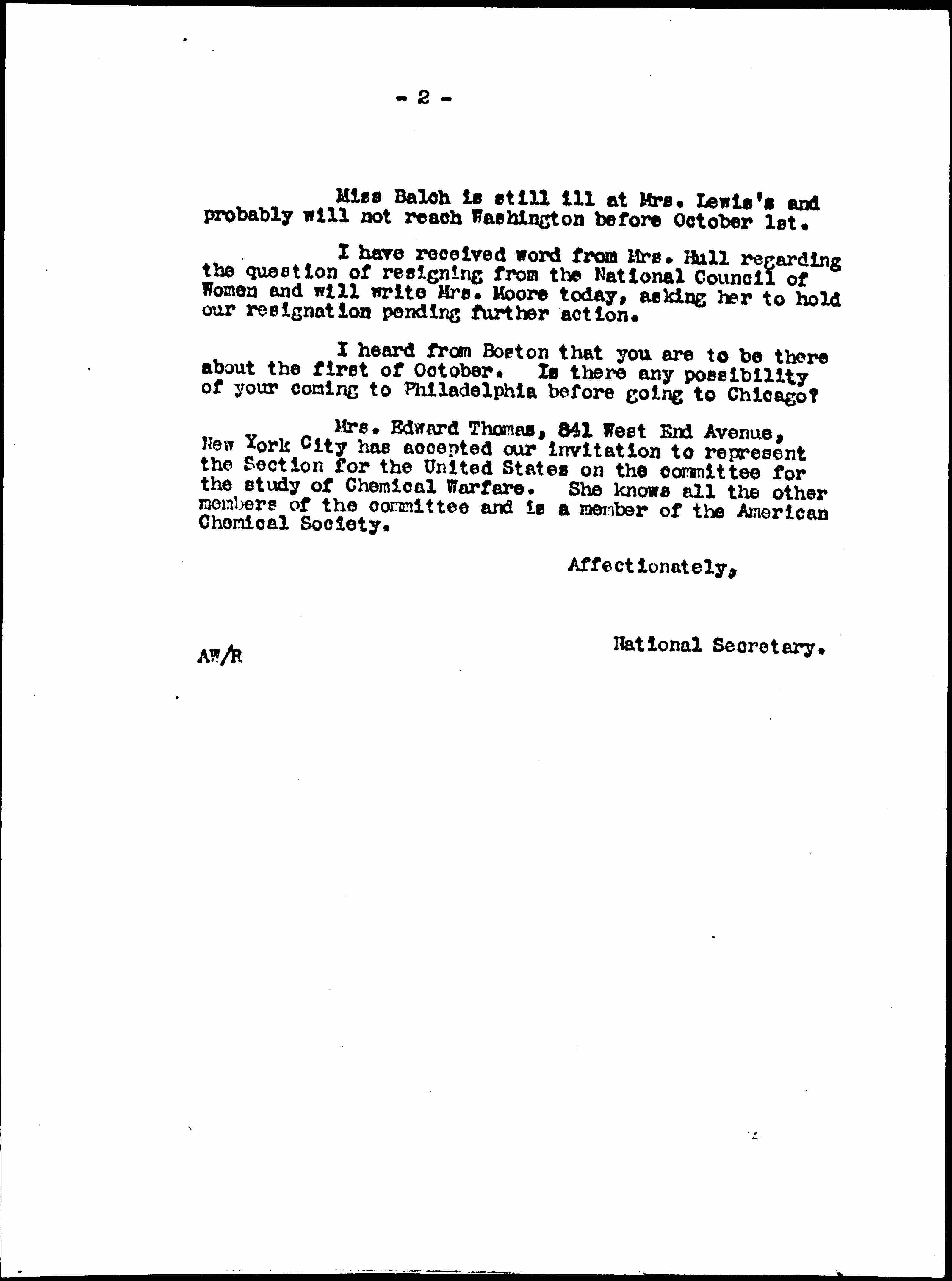 Mrs. Edward Thomas, 841 West End Avenue, New York City has accepted our initiation to represent the Section for the United States on the committee for the study of Chemical Warfare. She knows all the other members of the committee and is a member of the American Chemical Society.