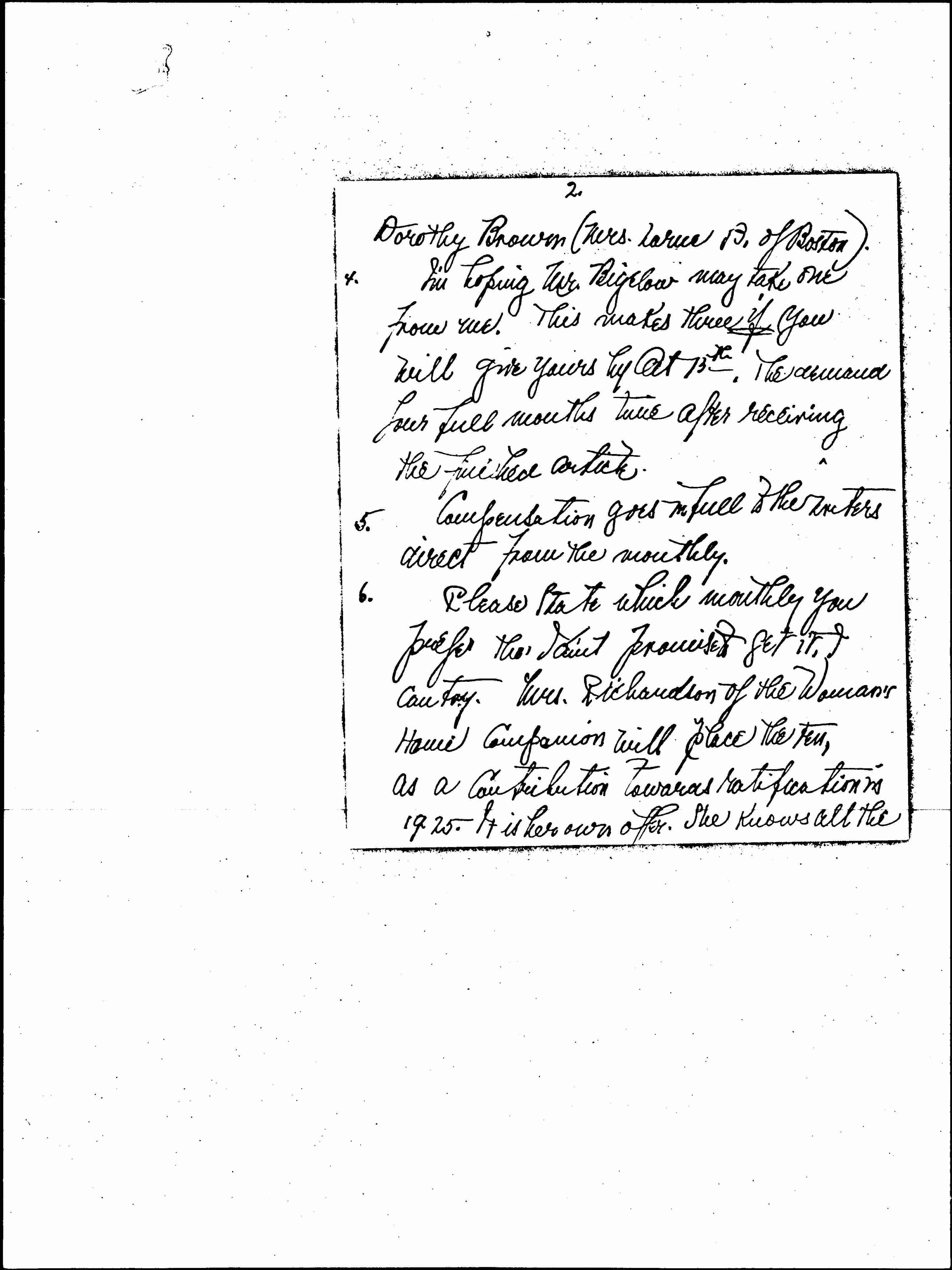 6. Please state which monthly you prefer [though] I don't promise to get it, I can try. Mrs. Richardson of the Woman's Home Companion will place the ten, as a contribution towards ratification in 1925. It is her own offer. She knows all the [missing page(s)?] [page 3]