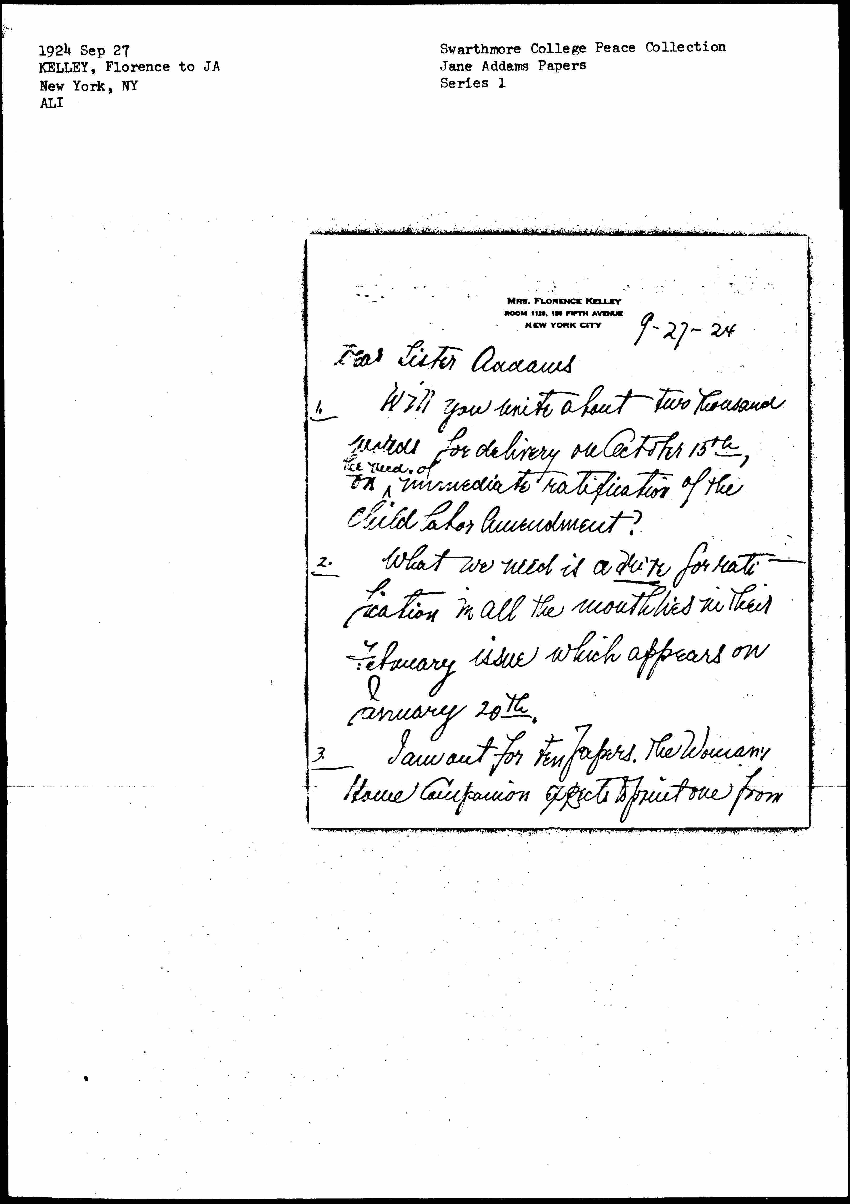 1. Will you write about two thousand words for delivery on October 15th, on ↑the need of↓ immediate ratification of the Child Labor Amendment?