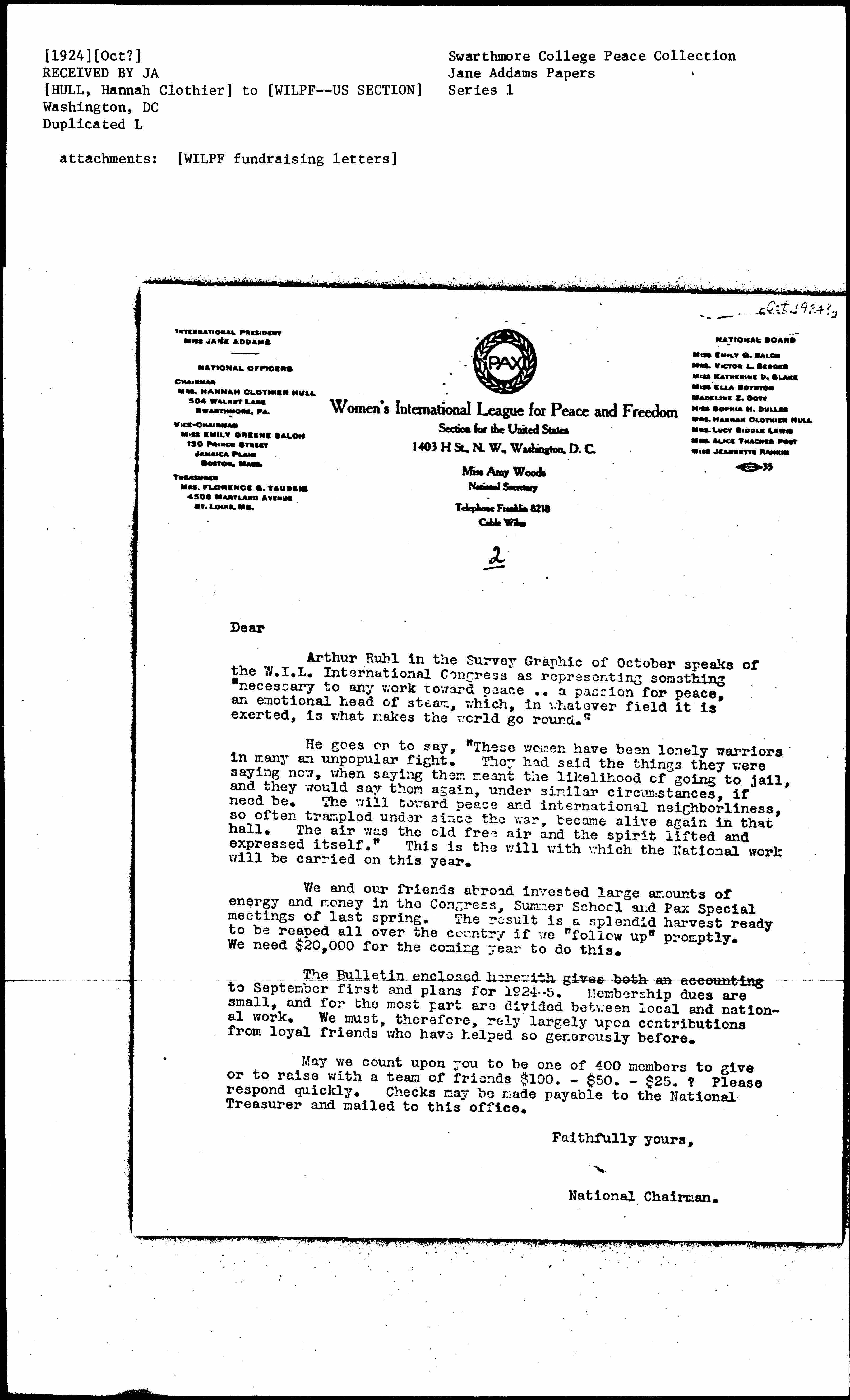 The Bulletin enclosed herewith gives both an accounting to September first and plans for 1924-5. Membership dues are small, and for the most part are divided between local and national work. We must, therefore, rely largely upon contributions from loyal friends who have helped so generously before.